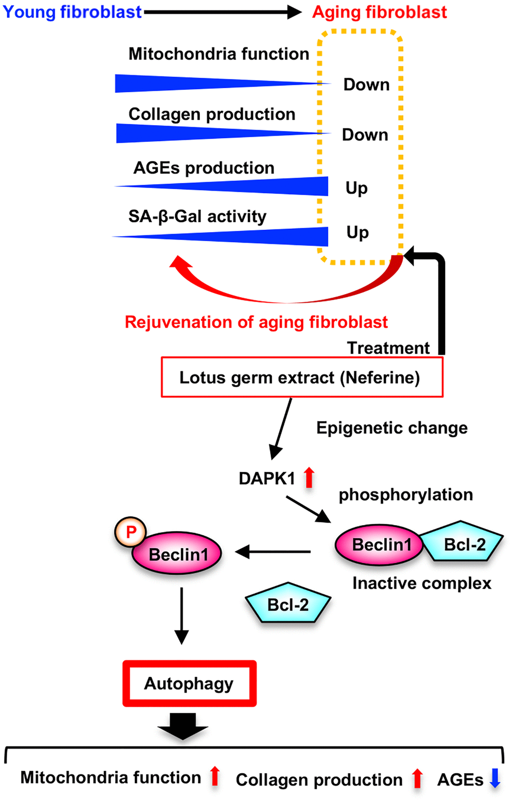 This study reports that disruption of proteostasis attenuated mitochondrial function upon proliferative and replicative senescence before the induction of DNA damage signaling, and the clearance of abnormal substances via autophagy restored mitochondrial function in aging fibroblasts, which is an early stage of cellular senescence. We screened 75 plant extracts that restored mitochondrial function in aging fibroblasts and discovered that lotus (Nelumbo nucifera Gaertn.) germ extract reduced the activity of senescence-associated β-galactosidase (SA-β-gal), a marker of aging, and activated mitochondria via induction of autophagy, which degraded lipofuscin aggregates and AGEs, which increased the aging process. Analysis of the molecular mechanism of lotus germ extract indicated that it induced autophagic signaling; upregulated DAPK1 expression, which is downregulated in an aging-dependent manner; stimulated the phosphorylation of beclin1; and then induced autophagy. We also found that aging-dependent histone acetylation and methylation are related to the suppression of DAPK1 expression and that lotus germ extract causes epigenetic changes close to those observed in youth. Moreover, the treatment of aging fibroblasts with lotus germ extract stimulated collagen production and contractile ability in three-dimensional cell culture. Thus, the induction of noncanonical autophagic signaling via DAPK1 upregulation is a new antiaging target to restore mitochondrial function by the restoration of disturbed proteostasis in the early stages of cellular senescence. Additionally, lotus germ extract was found to rejuvenate aging fibroblasts and is thus a promising new antiaging material.
