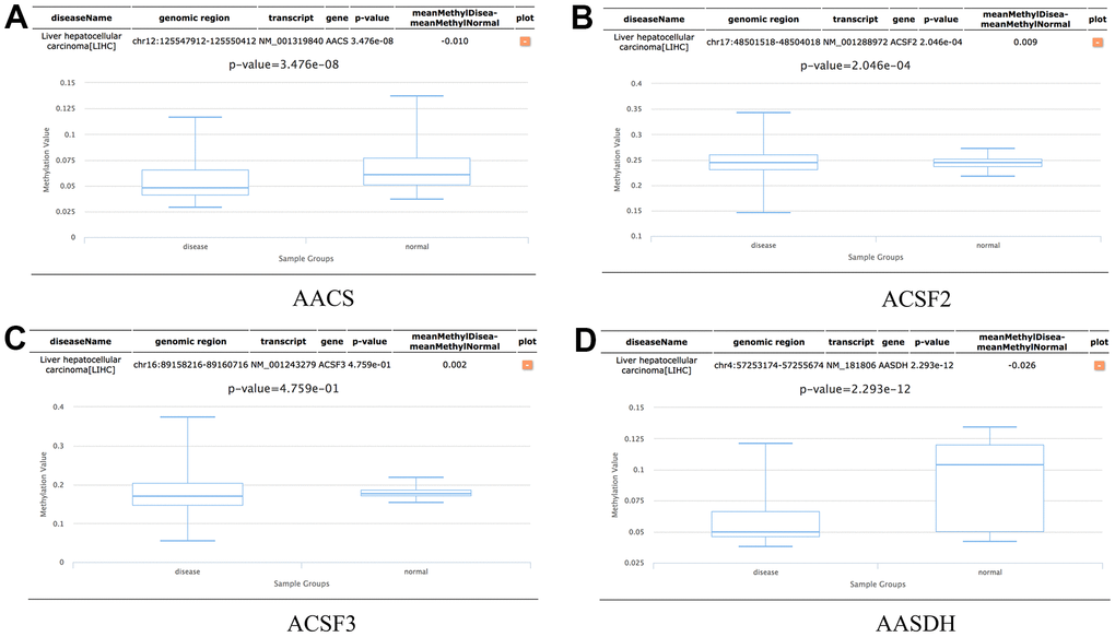 In addition, the methylation levels of ACSF gene family in HCC patients were analyzed through the Diseasemeth database. The analysis data showed that the DNA methylation levels of AACS (p=3.476E-08) and AASDH (p=2.293E-12) were lower in HCC tissues than in normal tissues, but ACSF2 (p=2.046E-04) was higher in HCC than in normal cases (Figure 7A–7D). These DNA methylation changes could indicate possibly the difference of ACSF gene family in expression levels to a certain extent in HCC patients.
