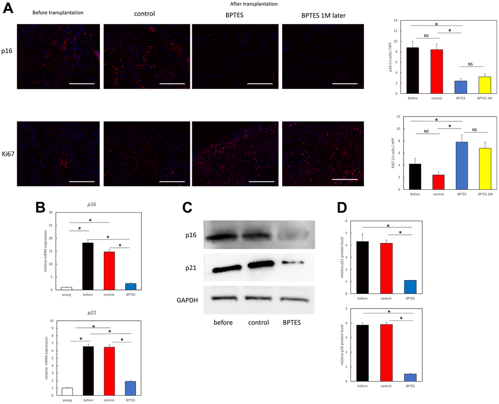 In addition, real-time PCR showed that the aging-related markers p16 (before vs. BPTES: p = 0.0066; control vs. BPTES: p = 0.0024) and p21 (before vs. BPTES: p = 0.0013; control vs. BPTES: p = 0.0013) were significantly suppressed at the mRNA level in the BPTES-treated group compared with that in the pre-transplant and control-treated groups (Figure 4B). Western blot analysis showed a significant accumulation of p16 and p21 in the skin before transplantation and in the control-treated group; however, their levels were significantly reduced in the BPTES-treated group (Figure 4C). Quantitative analysis demonstrated that relative p16 protein levels were significantly reduced in BPTES-treated skin grafts compared with that in pre-transplant and control-treated skin grafts (Figure 4D; before vs. BPTES: p = 0.0013; control vs. BPTES: p = 0.0013). Moreover, relative p21 protein levels were also significantly reduced in BPTES-treated skin grafts compared with that in pre-implantation and control-treated skin grafts (Figure 4D; before vs. BPTES: p = 0.0013; control vs. BPTES: p = 0.0013). These results suggest that treatment with senescent cell-depleting drugs may reduce senescent cells in the skin of aging mice.