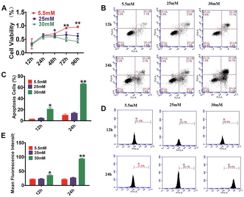 Figure 2. Glucose effects on HaCaT cells by CCK-8 assay, AnexinV-PI, and ROS staining. (A) HaCaT cells were treated with different concentrations of glucose for varying time periods, and then cell viability was measured with CCK-8. The data showed that glucose inhibited the cell viability of HaCaT cells in a dosage- and time-dependent way. (B) The annexin V-PI flow cytometry assay was utilized for the detection of the apoptosis rate of HaCaT cells, which were treated with 5.5, 25, or 30 mM glucose at different times. (C) The histogram results show that cell apoptosis increased following incubation with glucose. (D, E) Analysis of intracellular ROS levels using the flow cytometry assay. The histogram results show that the fluorescence intensity was increased following incubation with glucose. Control to 5.5 mM glucose, *P<0.05, **P<0.01, all results are representative of three separate experiments (means ± SD).