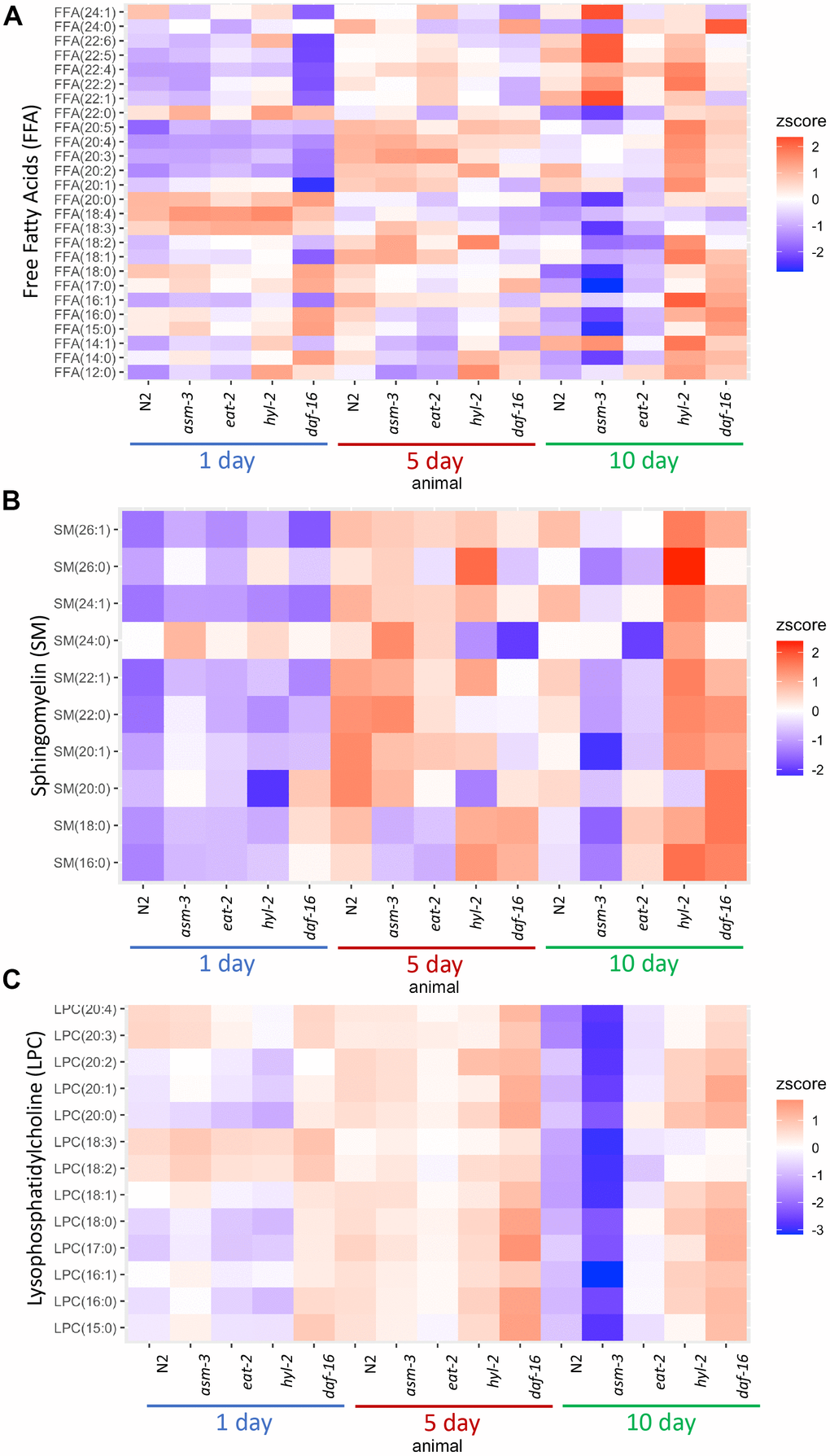 Figure 3. Lipid profiles vary by age and genotype. Heatmaps showing average z-score of log2 concentration for (A) free fatty acids (FFA), (B) sphingomyelins, and (C) lysophosphatidylcholines (LPCs). For sphingomyelins, the lipid ID does not include the 18:1 fatty acid chain, and LIPIDMAPS nomenclature is reported in Supplementary Table 11. Wildtype, asm-3, eat-2, hyl-2, and daf-16 worms were analyzed at 1-, 5- and 10-days old. For all, the heatmaps show averaged z scores for the six replicates in each group.