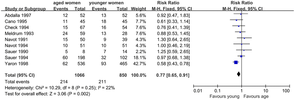 Additionally, LBR was evaluated, and nine studies were included. The results of meta-analysis showed no significant difference in LBR between women with AMA and younger women. Good homogeneity was observed in the results (I2=22%, P=0.25). The fixed effect model combined RR was 0.77 (95% CI, 0.65, 0.91, P=0.002) (Figure 5).