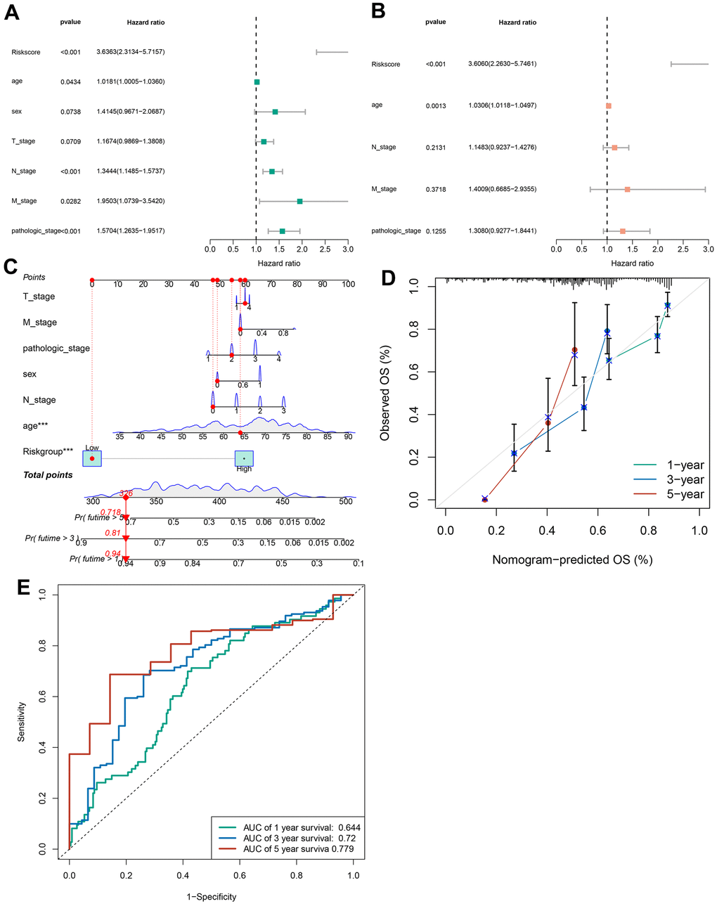 Figure 6. Construction of a nomogram. (A) The correlations between the risk score for OS and clinicopathological factors by univariate Cox regression analysis. (B) The correlations between the risk score for OS and clinicopathological factors by multivariate Cox regression analysis. (C) Details of the nomogram. (D) The calibration curve for predicting 1-, 3-, and 5-year OS. (E) Time-dependent ROC curve of risk score predicting the 1-, 3-, and 5-year OS in TCGA dataset.