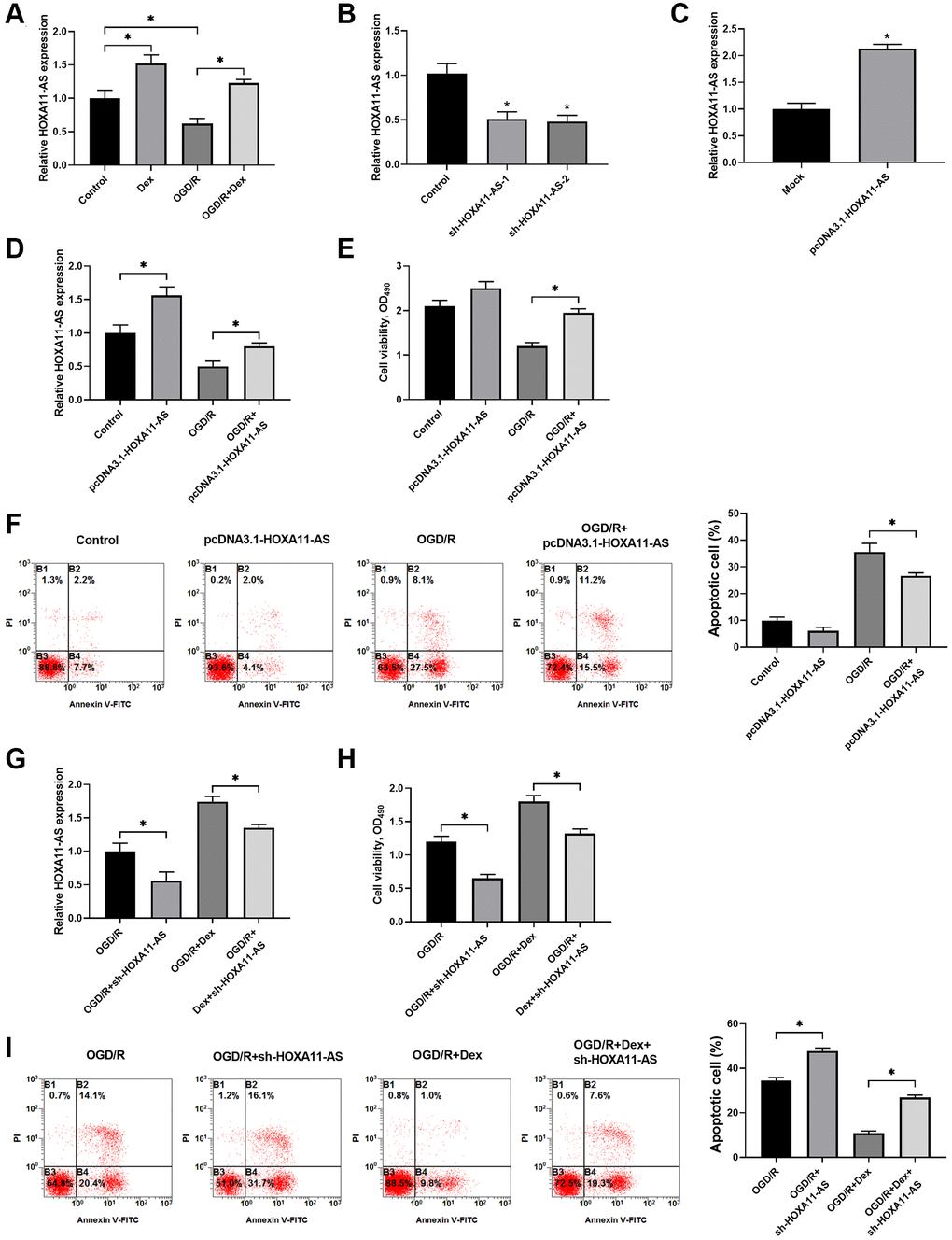 Figure 2. Dex treatment protected OGD/R-exposed Neuro-2a cells through up-regulation of HOXA11-AS expression and increased cell survival. (A) Neuro-2a cells with or without OGD/R were pre-treated with 10 μM Dex. The expression of HOXA11-AS was determined by quantitative real-time PCR. (B, C) Knockdown (B) and over-expression (C) of HOXA11-AS by transfection of sh-HOXA11-AS and pcDNA3.1-HOXA11-AS, respectively, were verified by quantitative real-time PCR. (D–F) Neuro-2a cells were transfected with control empty vector or pcDNA3.1-HOXA11-AS vector, and were left untreated or received OGD/R. Relative expression of HOXA11-AS (D), cell proliferation (E) and apoptosis of cells (F) in the indicated groups were quantitated. (G–I) Neuro-2a cells transfected with control sh-RNA or sh-HOXA11-AS were left untreated or treated with 10 μM Dex. Cells were then subjected to OGD/R. Relative expression of HOXA11-AS (G), cell proliferation (H) and apoptosis of cells (I) in the indicated groups were quantitated. n = 3 for each group; *P < 0.05, compared between the indicated groups.