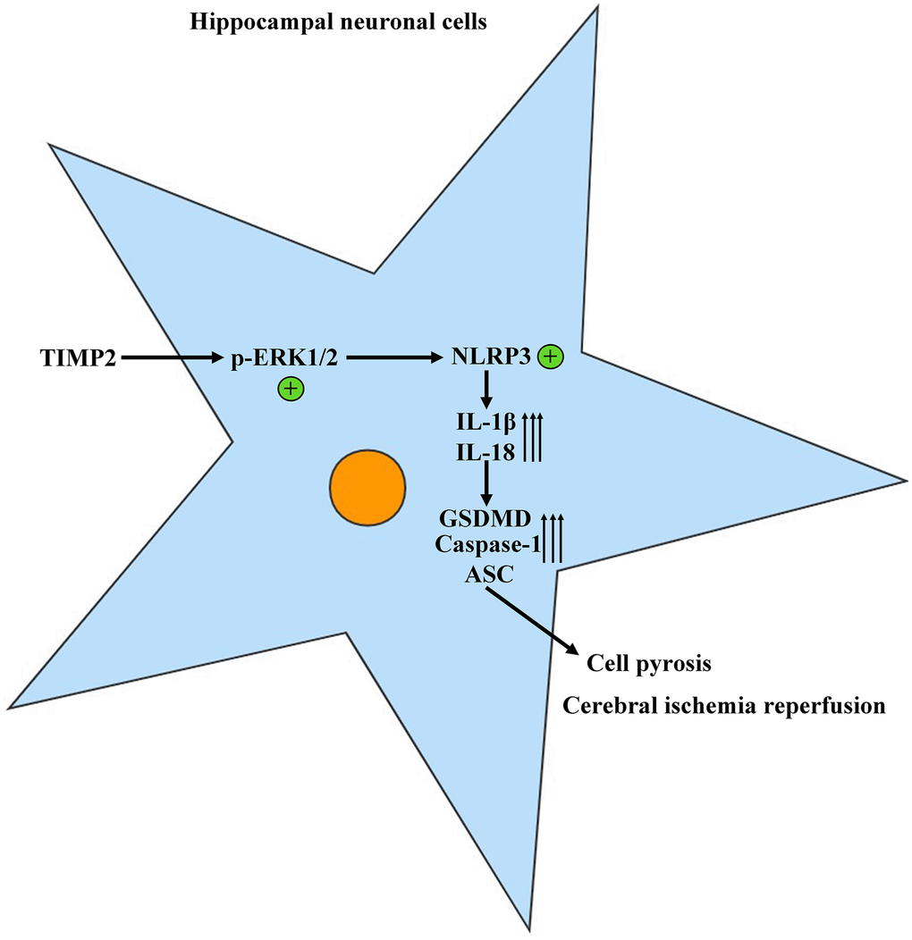 The protein expression levels of TIMP2, p-ERK1/2, t-ERK1/2, NLRP3, IL-1β, IL-18, GSDMD, Caspase-1, and ASC in brain tissues and hippocampal neurons were evaluated using Western blotting. The results revealed that the expression levels of these proteins were significantly higher in the experimental groups than those in the control group. Moreover, the expression levels were further increased in the I/R+TIMP2 group compared with those in the I/R group. Conversely, the expression levels of the above-mentioned proteins were significantly lower in the TIMP2-KD group than those in the I/R group (Figure 4). In summary, TIMP2 was found to facilitate the occurrence and progression of CIRI by activating NLRP3-mediated pyroptosis. The findings indicated that TIMP2 is highly expressed in CIR, promoting the pyroptosis of hippocampal somatic cells through the NLRP3 signaling pathway-related proteins, ultimately aggravating CIRI (Figure 5).