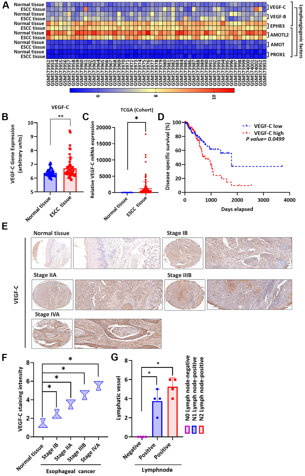 Figure 2. Clinicopathologic features of VEGF-C expression in human ESCC tissue. (A) The gene expression profiles of VEGF-C in ESCC tissue and normal tissue samples were analyzed in GEO and TCGA database records. (B, C) Levels of VEGF-C expression were significantly higher in ESCC samples compared with the normal tissue samples. (D) Kaplan-Meier analysis of overall survival according to VEGF-C expression in patients with esophageal cancer. (E, F) The human ESCC tissue array specimens were subjected to IHC evaluations with VEGF-C antibody, and the positive staining was quantified by IHC scoring (N = 4 per group). Scale bar: 100 μm. (G) Positive peritumoral lymphatic vessel density in patients with N0, N1, or N2 ESCC tissue array samples (N = 4 per group). *P < 0.05 compared with normal tissue samples or N0 lymph node negative tissue array samples.