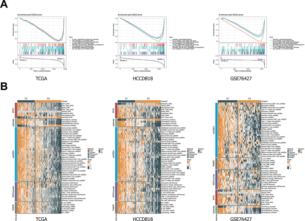 The pathway analysis of the C1 and C2 subtypes was performed using GSEA in the TCGA-LIHC, HCCDB18 and GSE76427 datasets. Pathways, including chemokine signaling pathway, B cell receptor signaling pathway, T cell receptor signaling pathway, and natural killer cell mediated cytotoxicity, were significantly enriched in C1 subtype (Figure 4A). In addition, all EPIC, ESTIMATE, ssGSEA, MCPcounter and TIMER results demonstrated higher immune scores of the C1 subtype than the C2 subtype, and the differences were statistically significant (Figure 4B).