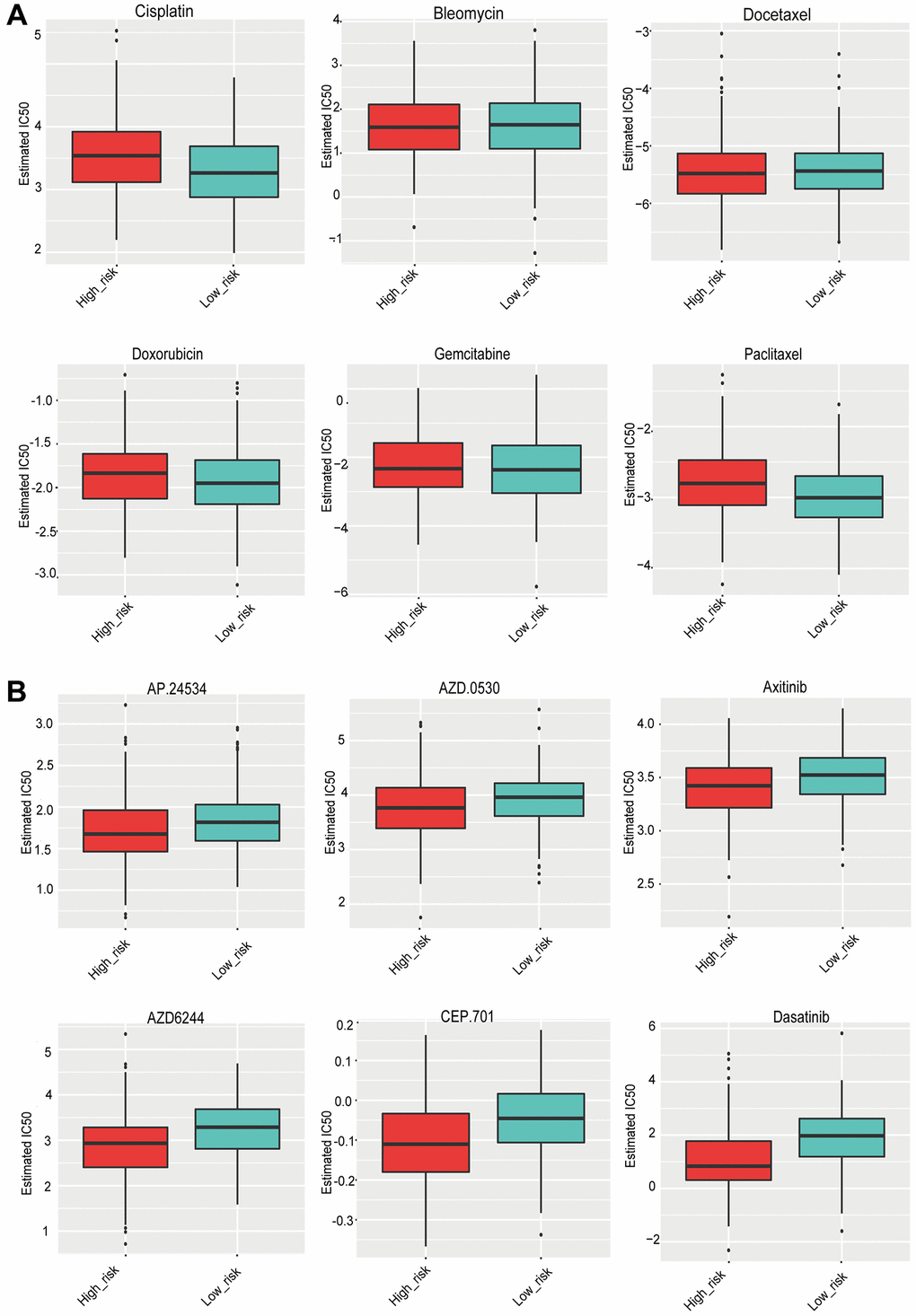 Based on the pRRophetic algorithm, 35 drugs exhibited statistically significant differences (Supplementary Table 1). The data was visualized using boxplots. The IC50 values for six common chemotherapeutic drugs (cisplatin, bleomycin, docetaxel, doxorubicin, gemcitabine, and paclitaxel) did not change significantly between the high- and low-risk groups (Figure 7A). Several drugs with significant differences were targeted drugs, including ponatinib, Saracatinib, Axitinib, and Lestaurtinib, all of which had a higher IC50 in the low-risk group (Figure 7B). In other words, patients in the high-risk group appeared to be more susceptible to these targeted drugs.