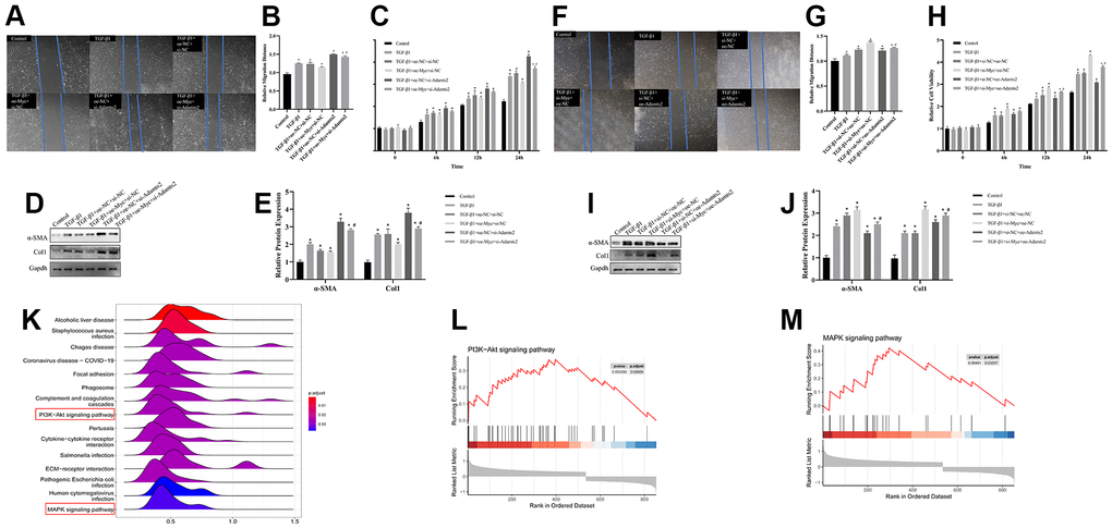 Figure 11. The regulatory effect of TGF-β-MYC-ADAMTS2 axis on CFs. (A) The migration ability of CFs was showed by wound healing assay. (B) The relative migration distance of CFs. * P < 0.05 vs. the Control group. # P < 0.05 vs. the TGF-β1+oe-NC+si-Adamts2 group. (C) The cell viability was calculated by CCK-8. * P < 0.05 vs. the Control group. # P < 0.05 vs. the TGF-β1+oe-NC+si-Adamts2 group. (D) The expression of α-SMA and Col1 was determined by western blot. (E) The relative protein expression of α-SMA and Col. * P < 0.05 vs. the Control group. # P < 0.05 vs. the TGF-β1+oe-NC+si-Adamts2 group. (F) The migration ability of CFs was showed by wound healing assay. (G) The relative migration distance of CFs. * P < 0.05 vs. the Control group. # P < 0.05 vs. the TGF-β1+si-NC+oe-Adamts2 group. (H) The cell viability was calculated by CCK-8. * P < 0.05 vs. the Control group. # P < 0.05 vs. the TGF-β1+si-NC+oe-Adamts2 group. (I) The expression of α-SMA and Col1 was determined by western blot. * P < 0.05 vs. the Control group. # P < 0.05 vs. the TGF-β1+si-NC+oe-Adamts2 group. (J) The relative protein expression of α-SMA and Col. * P < 0.05 vs. the Control group. # P < 0.05 vs. the TGF-β1+si-NC+oe-Adamts2 group. (K) The ridgeplot for the GESA results of ADAMTS2. (L) The PI3K-Akt signaling pathway for ADAMTS2. (M) The MAPK signaling pathway for ADAMTS2.