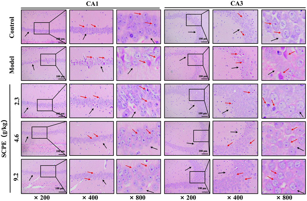 Compared with the normal control group, the target latency of CI model mice (F = 21.39; P < 0.0001) and total swimming distance (F = 14.5, P < 0.0001) increased significantly. Two-way ANOVA showed significant differences in the target latency (F = 10.55; P < 0.0001) and total swimming distance (F = 17.15; P < 0.0001) between the SCPE treatment group and model group. The goal latency of the 9.2 g/kg SCPE-treated group on day 3 (P < 0.05) and total swimming distance on day 2 (P < 0.05) were significantly higher than those of the 2.3 g/kg SCPE-treated group. No significant differences in the target goal latency or total swimming distance were observed between the other groups.