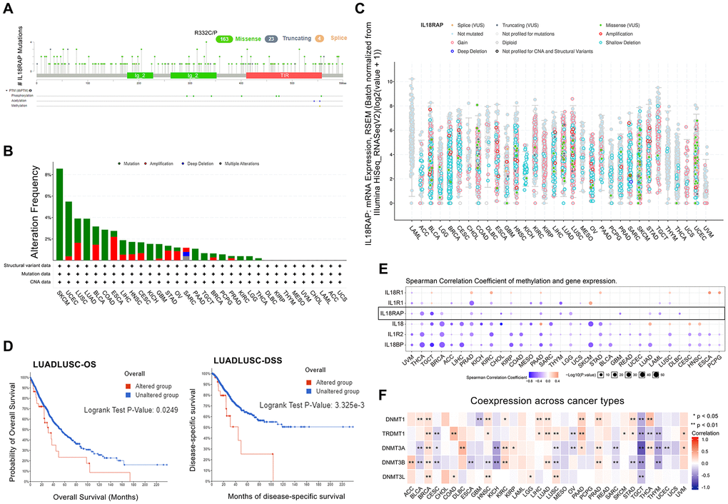 Figure 3. The genetic alteration and DNA modification character of IL18RAP. (A) The frequency and types of IL18RAP somatic mutations in pan-cancer. (B) Alteration frequency of IL18RAP in pan-cancer. (C) The counts and types of IL18RAP mutation in pan-cancer. (D) OS and DSS analysis of LUADLUSC stratified by IL18RAP alteration status. (E) The relationship between IL18RAP expression and DNA methylation in pan-cancer was discovered using the GSCALite database. The results of IL18RAP were circled in the black box. (F) The relationship between IL18RAP expression and five methyltransferases in 33 different types of human cancers was examined using the TCGA database. *p < 0.05 and **p < 0.01.