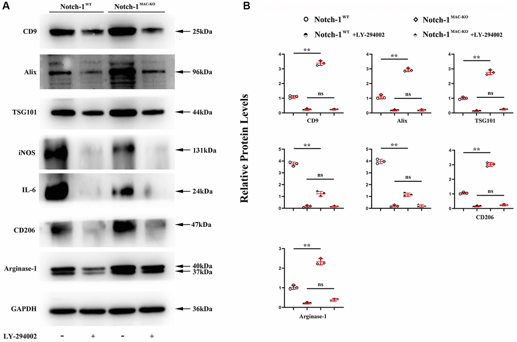 Figure 6. PI3K/AKT signaling pathway was involved in the Notch-1MAC-KO-induced M2 polarization. (A) Western blotting showed that CD9, TSG101, Alix, CD206 and Arg-1 were significantly enhanced in peritoneal macrophages of Notch-1MAC-KO mice, but iNOS and IL-6 were significantly reduced, which were reversed by LY-294002. Compared with W.T. group, the expression levels of CD9, TSG101, Alix and Arg-1 were enhanced in K.O. group; (B) statistical data for Western blot. *P < 0.05, **P > 0.01: Notch-1MAC-KO vs. Notch-1WT, Notch-1WT vs. Notch-1WT + LY-294002, Notch-1MAC-KO vs. Notch-1MAC-KO + LY-294002.
