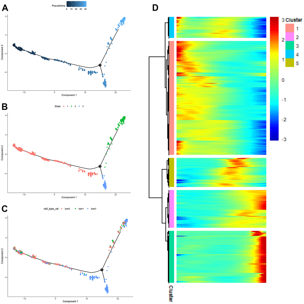 It could be seen from Figure 9A that the three subpopulations were divided into three developmental states. Figure 9B showed the timeline of cell differentiation, with the shades of color representing early and late developmental stages. Figure 9C introduces the developmental stages in which different subpopulations of CAFs were located. As could be seen from Figure 9C, most type2 cells were at the early developmental stage of CAFs, most type3 cells were at the middle developmental stage of CAFs, and most type1 cells were at middle and late developmental stages of CAFs. The expression heat map of genes was drawn according to the developmental trajectory, and these genes were clustered into 5 modules (Figure 9D). From the heat map, it was observed that cluster1, cluster5, and cluster3 represented the early, middle, and late stages of CAFs development, respectively.