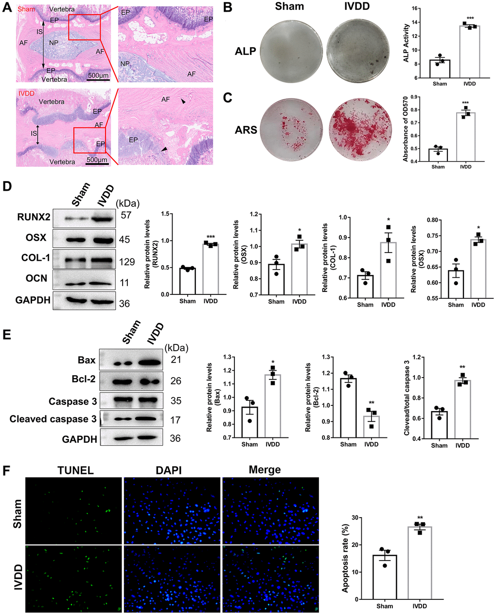 Figure 1. Characterization of IVDD rat model-derived Afs. (A) HE staining of Co6-7 intervertebral disk of rats from the sham and IVDD groups (n = 6). Abbreviations: AF: annulus fibrosus; NP: nucleus pulposus; IS: intervertebral space; EP: endplate. Scale bar = 500 μm. The black arrows represent AF and EP cells, respectively. (B) ALP and (C) ARS staining assays were used to evaluate the osteogenic differentiation level (n = 3). (D) The markers for osteogenic differentiation were detected using a western blotting assay (n = 3). (E) A western blotting assay examined apoptosis-related protein levels. (n = 3) (F) TUNEL assay was performed to analyze the apoptosis of AFs (n = 3). (*p < 0.05, **p < 0.01, and ***p < 0.001).