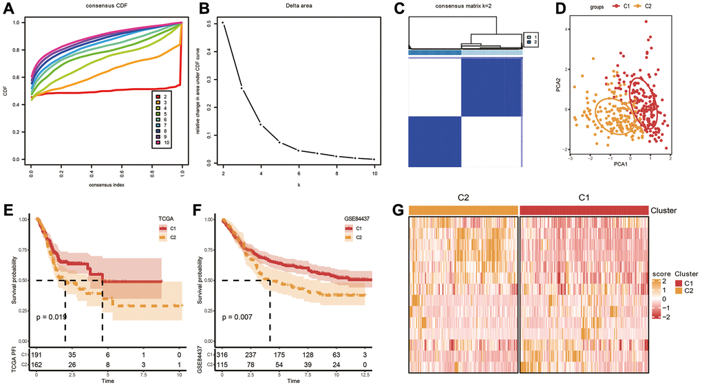 Figure 2. Identification of molecular subtypes. (A) Cumulative distribution function. (B) Delta area. (C, D) Heatmap and PCA plots of sample clustering when k = 2 in TCGA-STAD. (E, F) K-M survival analysis of C1 and C2 in TCGA-STAD and GSE84437 datasets. (G) Expression levels of 14 genes in C1 and C2 subtypes based on TCGA-STAD dataset.