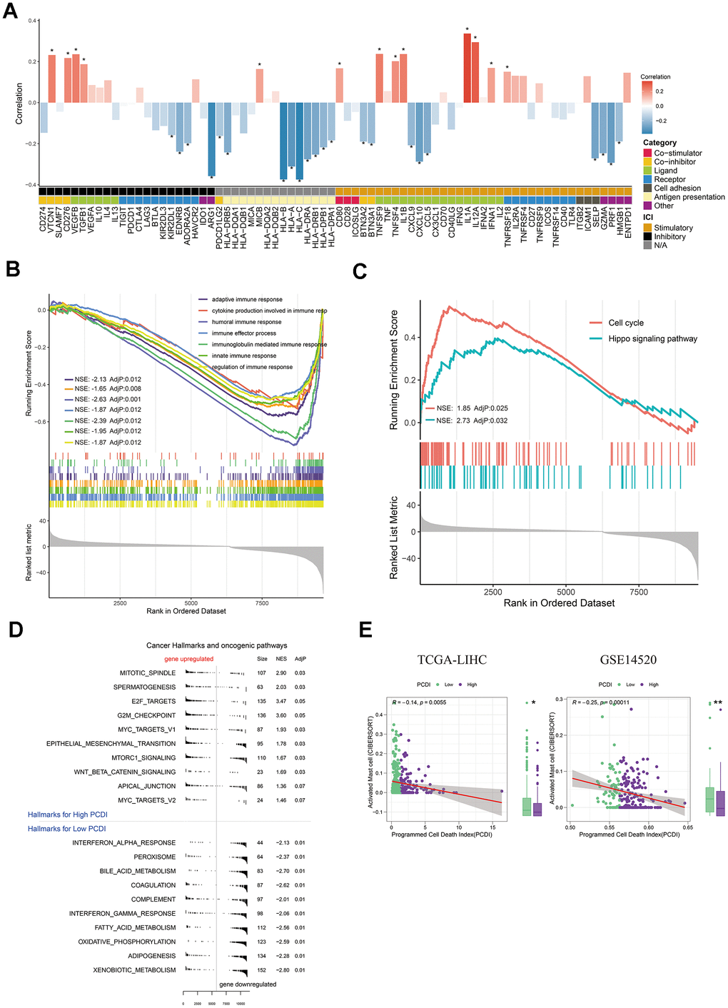 Figure 5. Exploration of the potential mechanism of PCDI. (A) Bar plot illustrating the correlation between immunomodulators and PCDI in the TCGA dataset. (B) GO enrichment analysis of immune response-related pathways in the two PCDI groups. (C) KEGG enrichment analysis of immune response-related pathways in the two PCDI groups. (D) Gene set enrichment analysis (GSEA) highlighting hallmark pathways in the two PCDI groups. (E) Correlation analysis between the fraction of activated Mast cells calculated by CIBERSORT and PCDI in the TCGA and GSE14520 datasets. (*P < 0.05, **P < 0.01, and ***P < 0.001 determined by Wilcoxon test).
