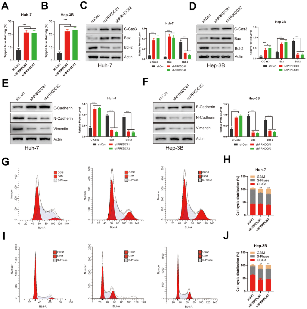 Figure 8. PRKDC knockdown induced cell death, EMT, and halted the cell cycle in LIHC. (A, B) Relative cell death percentages in Huh-7 or Hep-3B cells using trypan blue staining. (C, D) Protein level of apoptosis related markers in Huh-7 or Hep-3B cells. (E, F) Protein level of EMT related markers in Huh-7 or Hep-3B cells. (G–J) Cell cycle analysis between PRKDC knockdown and negative control groups in Huh-7 or Hep-3B cells using flow cytometry.