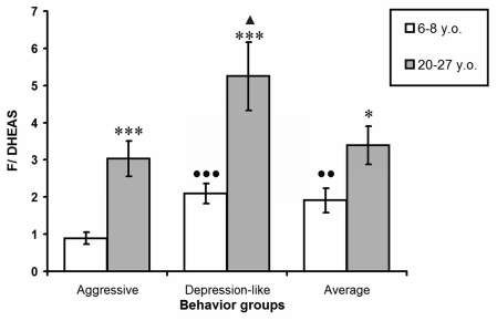 Figure 1. The molar ratio between F and DHEA-S plasma levels in young and old female rhesus monkeys with different types of behavior (mean ± S.E.M.)