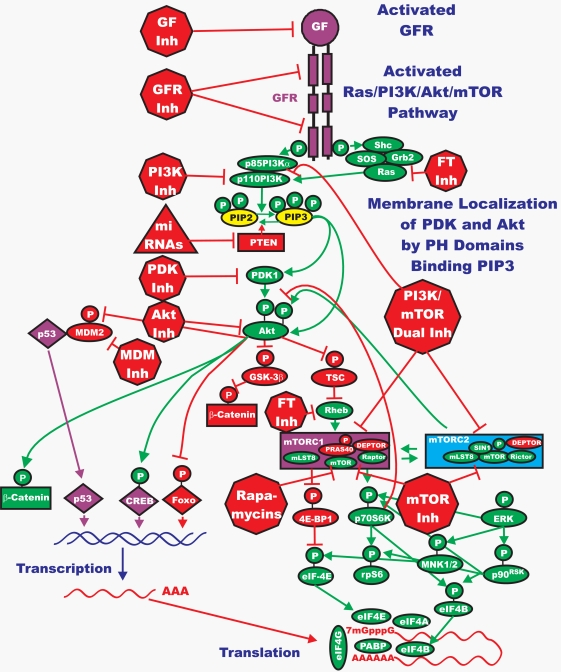 Figure 2. Overview of the Ras/PI3K/PTEN/Akt/mTOR Pathway and Potential Sites of Therapeutic Intervention. The Ras/PI3K/PTEN/mTOR pathway is regulated by Ras (indicted in green ovals), as well as various upstream growth factor receptors (indicated in purple). Sites where various small molecule inhibitors suppress this pathway are indicated by red octagons. Naturally occurring miRNAs have been discovered to certain components of this pathway (e.g., PTEN) and are indicated in a red triangle; other miRNAs to other components, especially tumor suppressor genes will likely be discovered. The downstream transcription factors regulated by this pathway are indicated in diamond shaped purple (active) or red (inactivated) outlines. This drawing depicts some of the complicated regulations of this pathway by both positive and negative phosphorylation events which serve to fine tune this pathway. Phosphorylation of some molecules by certain kinases (e.g., phosphorylation of β-catenin by glycogen synthase kinase-3β [GSK-3β], indicated in red oval) results in their proteosomal degradation (indicated in red box), while phosphorylation of some molecules by certain kinases (e.g., β-catenin by Akt) results in their activation (nuclear translocation, indicated in green box). The Ras/PI3K/PTEN/Akt/mTOR pathway plays a key role in regulating p53 activity (indicated in purple diamond) by phosphorylating MDM2 (indicated in red oval) which controls the stability of p53 by ubiquitination. The Ras/PI3K/PTEN/Akt/mTOR pathway plays a key role in regulating critical proteins involved in protein translation (indicated in green ovals), especially those necessary for the translation of “weak” mRNAs (mTORC1, grouped together a purple box). This pathway also indicates that Akt can result in the activation of downstream mTOR which can subsequently serve as either a negative feed back to inactivate Akt by p70S6K or activate Akt by mTORC2 (grouped together in a blue box). GF = growth factor, GFR = growth factor receptor.