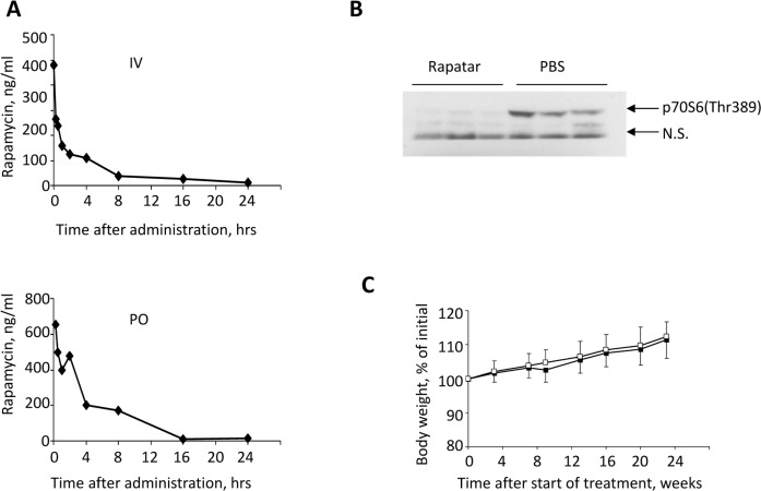 Pharmacokinetic and biological characteristics of Rapatar. (A) Rapamycin concentration-time profile in blood after intravenous (IV, top) and oral (PO, bottom) administration of Rapatar to mice (mean values, n = 3). A single dose of Rapatar was administered either IV (0.4mg/kg) or PO (4mg/kg). Blood samples were collected at designated times and analyzed for rapamycin by LC/MS/MS. (B) Rapatar blocks mTOR activation in vivo. Six C57/Bl/6J mice were food-deprived for 18 hrs. At the end of fasting period animals received either Rapatar (0.5mg/kg) or PBS via gavage and were allowed access to food. One hour later animals were sacrificed, livers were dissected and protein lysates were analyzed for mTOR activity by probing with p70S6(Thr389) antibody. (C) No acute or long-term toxicity are associated with PO administration of Rapatar. C57Bl/6J male mice received either Rapatar or PBS starting 8 weeks of age (10 mice/group) for 24 weeks according to the protocol described above. No loss in body weight was detected in experimental group throughout the treatment period. Both experimental and control groups showed similar gain in body weight with age.