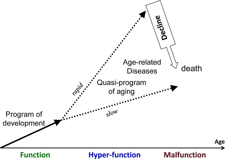 When development is finished cellular normal functions become excessive (hyperfunctions). They lead to diseases. Development is strictly programmed and therefore is precise (one line), whereas aging is not (a continuation of developmental program or quasi-program), and so age-related diseases (ADR) occur at different age.