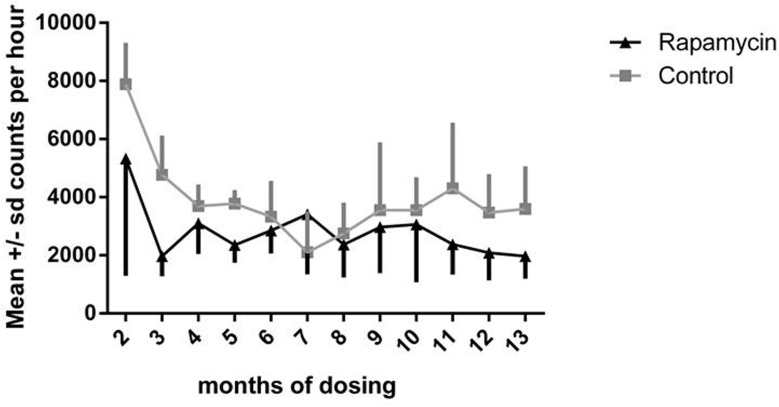 Accelerometer counts per hour for months 2-13 of dosing. Squares = control subjects; triangles= rapamycin subjects (mean ± SD).