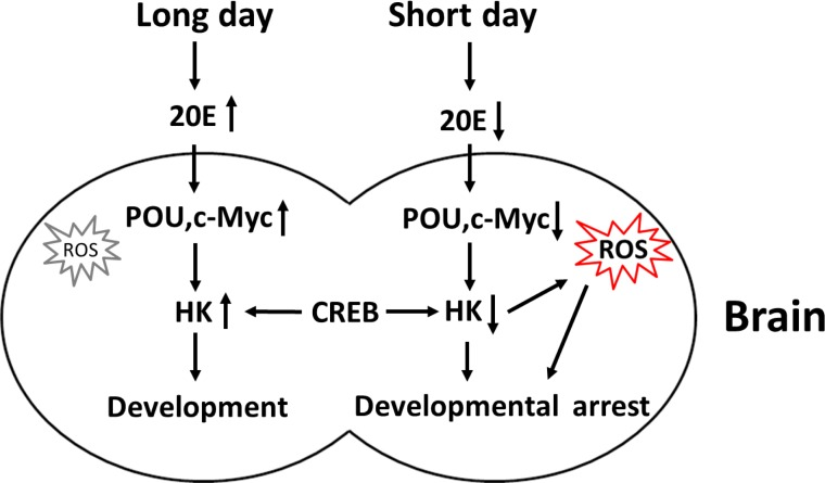Figure 7. Schematic representation of Har-HK regulation during insect diapause and development. Long day lengths trigger increased ecdysone (20E) levels, stimulating Har-POU and -c-Myc expression, and leading to high HK expression for development. In contrast, short day lengths repress ecdysone levels, resulting in low Har-POU and -c-Myc expression levels that lead to low Har-HK expression levels. Low HK expression levels cause low metabolic activity and increased ROS accumulation in diapause individuals. As a key diapause regulator, ROS induces entry into developmental arrest or lifespan extension.