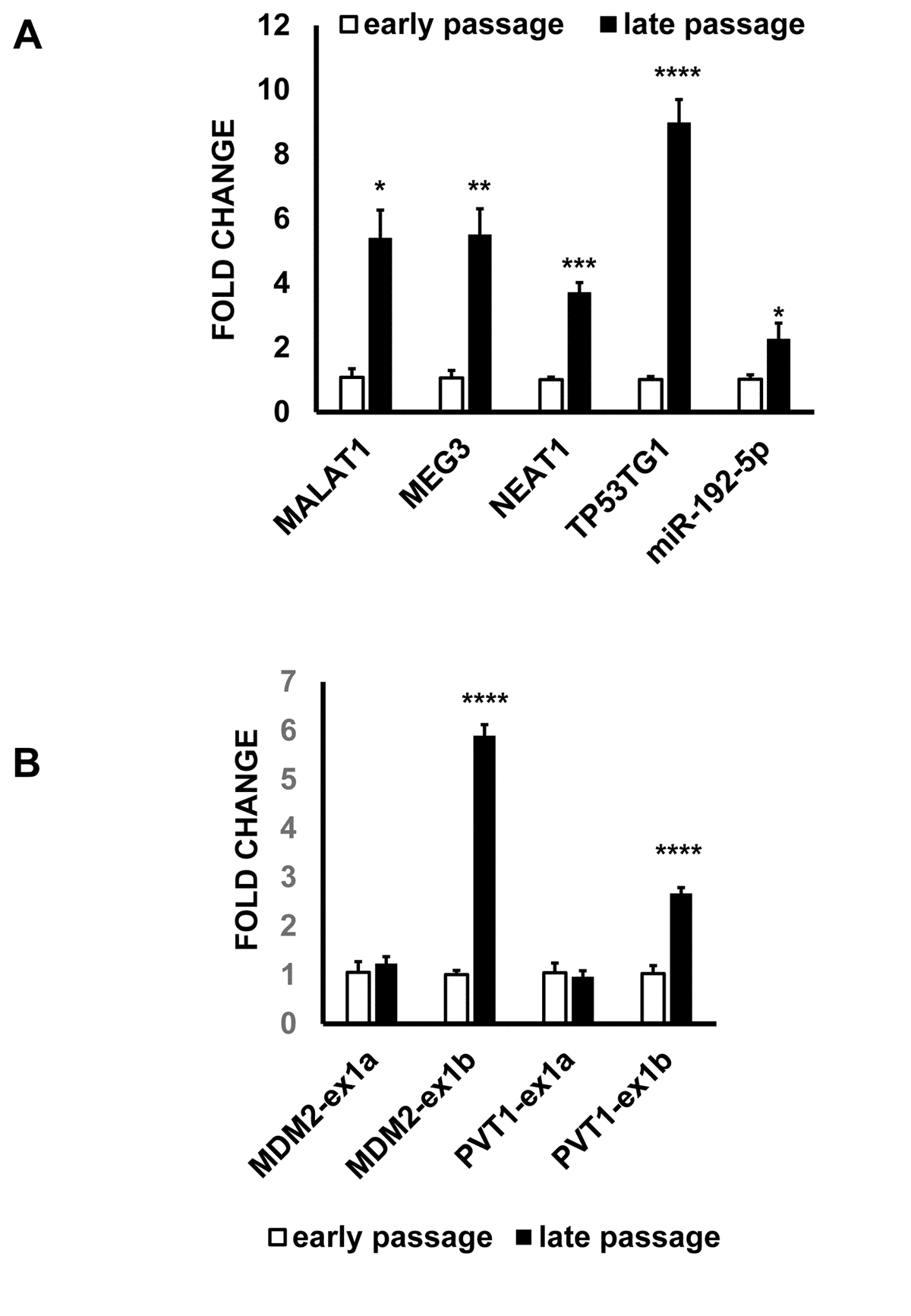 Figure 7. ncRNA alterations identified in H2O2-treated ECs are also present in senescent HUVEC. Total RNA was extracted from early and late passage HUVEC and the indicated RNAs were tested by qPCR. The bar graphs represent average values ±SEM (early passage n= 3, late passage n= 7; *p<0.05, **p<0.01, ***p<0.001, ****p<0.0001). (A) ncRNAs. (B) Differential exon usage. Exon 1b isoforms of MDM2 and PVT1 are p53-regulated.