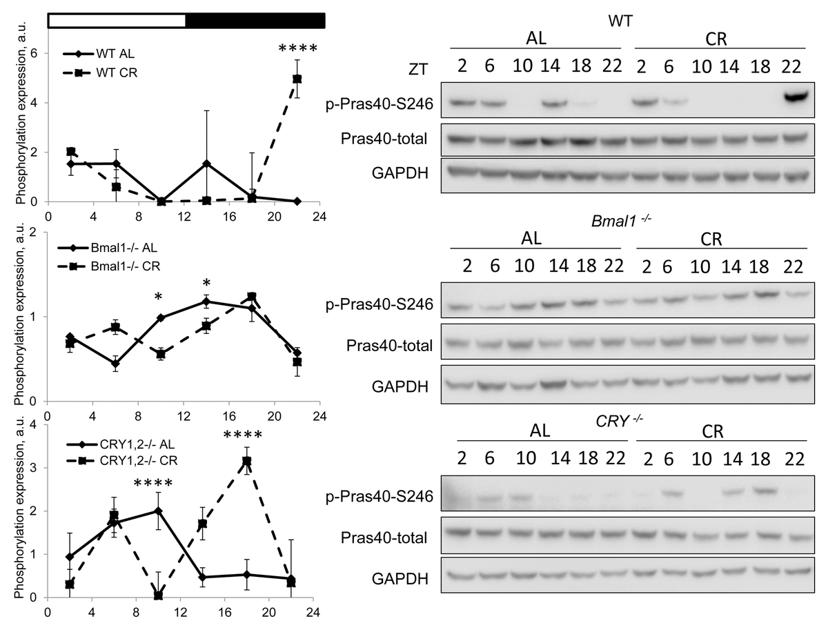 Figure 3. CR effect on AKT activity is time of the day and BMAL1 dependent. Activity of AKT in the liver of mice on AL and CR diets was assayed through phosphorylation of PRAS on S246. Representative WBs and quantification of diurnal rhythms in phosphorylation of PRAS in wild type mice (upper panels), Bmal1-/- mice (middle panels) and Cry1,2-/- mice (lower panels). (AL) – black diamonds, black solid line, 30% caloric restriction (CR) – black squares and dashed black lines. Two-way repeated ANOVA was used for statistical analysis, * - statistically significant difference (p<0.05) between diets (three male mice were used for every time point in both groups). Light and dark bars on the top of the figure represent light and dark phases of the day. ZT0 is the time when light is on and ZT12 is the time when light is off. Food for CR group was provided at ZT14. On the day of tissue collection at ZT14 tissues were harvested before mice receive the food.