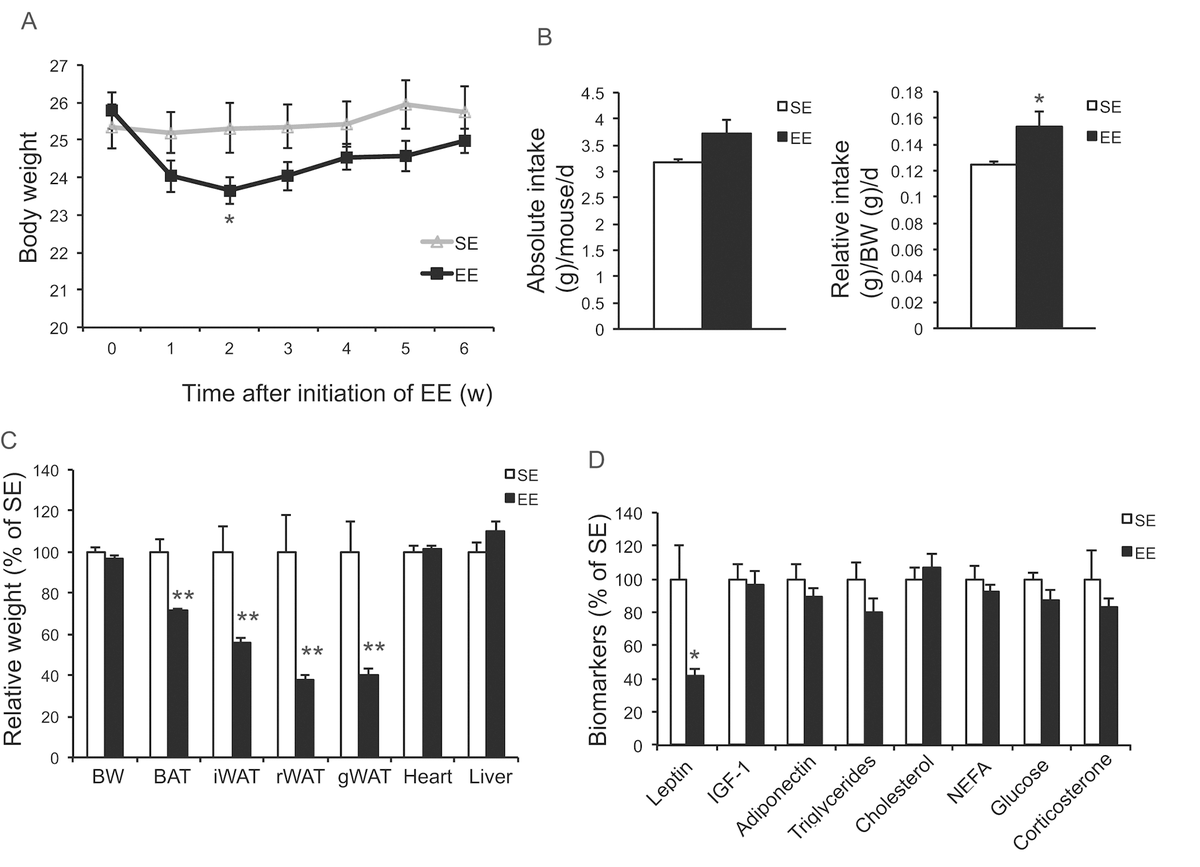 Figure 1. Short-term EE activates the HSA axis in 10-month old mice. (A) Body weight (n=10 per group). (B) Absolute (left) and relative (right) food intake. (C) Body and tissue weight at sacrifice after 6-week EE (n=10 per group). (D) Serum biomarkers at sacrifice (n=10 per group). * P<0.05, ** P<0.01. Values are means ± SEM.