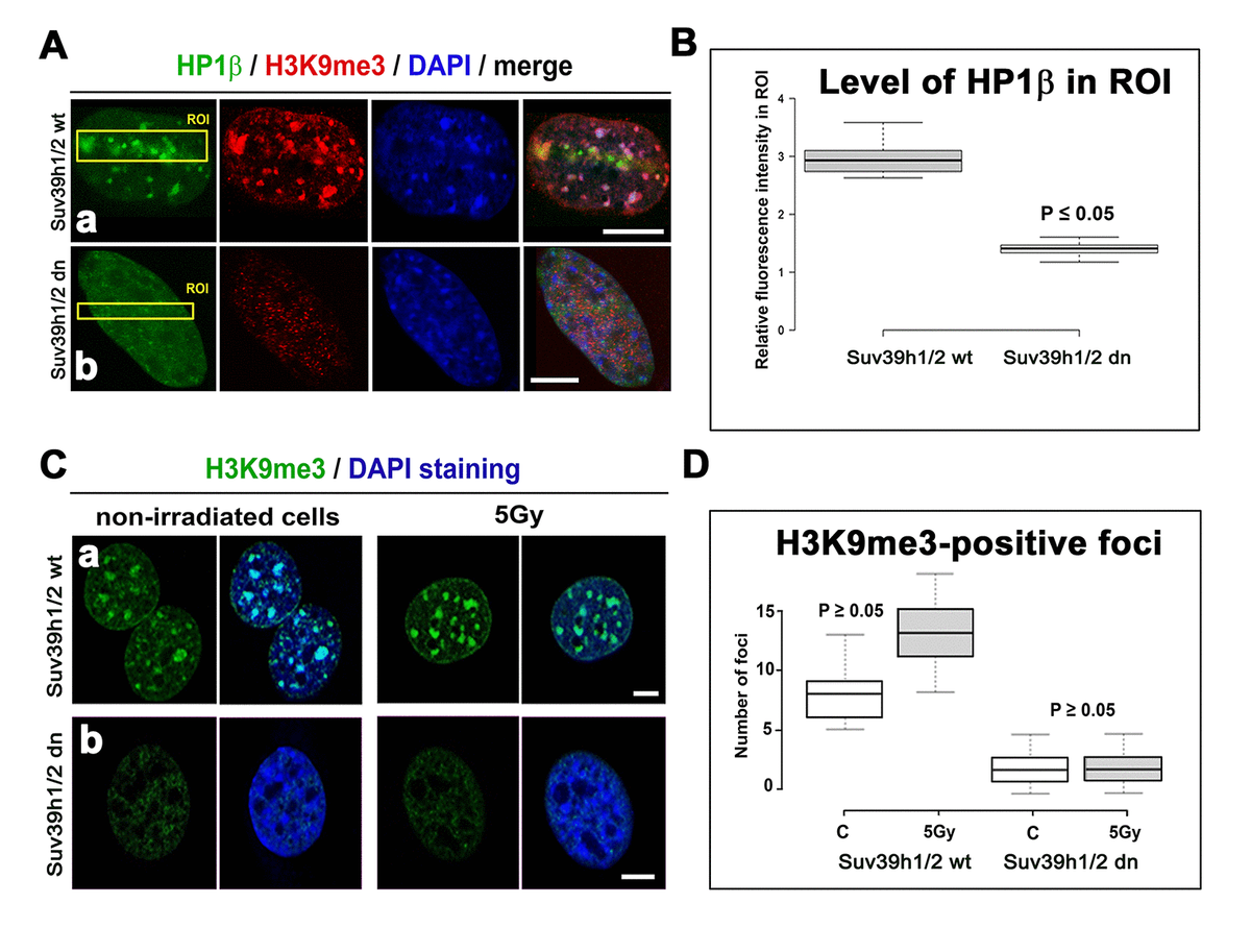 Figure 5. Accumulation of HP1β and H3K9 tri-methylation (red) in locally micro-irradiated genomic region of Suv39h1/h2 wt and Suv39h1/h2 dn MEFs. (Aa) The fluorescence of GFP-tagged HP1β (green) was decreased in regions of interest (ROIs are shown by yellow rectangles) in Suv39h1/h2 dn cells compared with the wt counterpart. The level of H3K9me3 was high in the chromocenters of locally micro-irradiated wt cells. H3K9me3 was very low in Suv39h1/h2 dn cells. (Ab) A decrease in GFP-tagged HP1β in irradiated ROI of Suv39h1/h2 dn cells. (B) Quantification of HP1β in UVA-irradiated ROI in Suv39h1/h2 wt and Suv39h1/h2 dn cells. Difference in the fluorescence intensity in ROI was statistically significant as shown by statistical analysis at P≤0.05 (Student’s t-test). (C) Nuclear distribution pattern of H3K9me3 (green) in non-irradiated and γ-irradiated Suv39h1/h2 wt and Suv39h1/h2 dn MEFs. Wild-type MEFs were characterized by H3K9me3-positivity in chromocenters (clusters of centromeric heterochromatin), while H3K9me3 was low in nuclei of Suv39h1/h2 dn cells. Scale bars are 10 µm. (D) Quantification of H3K9me3-positive foci in non-irradiated and γ-irradiated Suv39h1/h2 wt and Suv39h1/h2 dn MEFs. Irradiation by γ-rays did not significantly affect a number of H3K9me-positive foci, as shown by statistical analysis (P≥0.05); Student’s t-test was used.