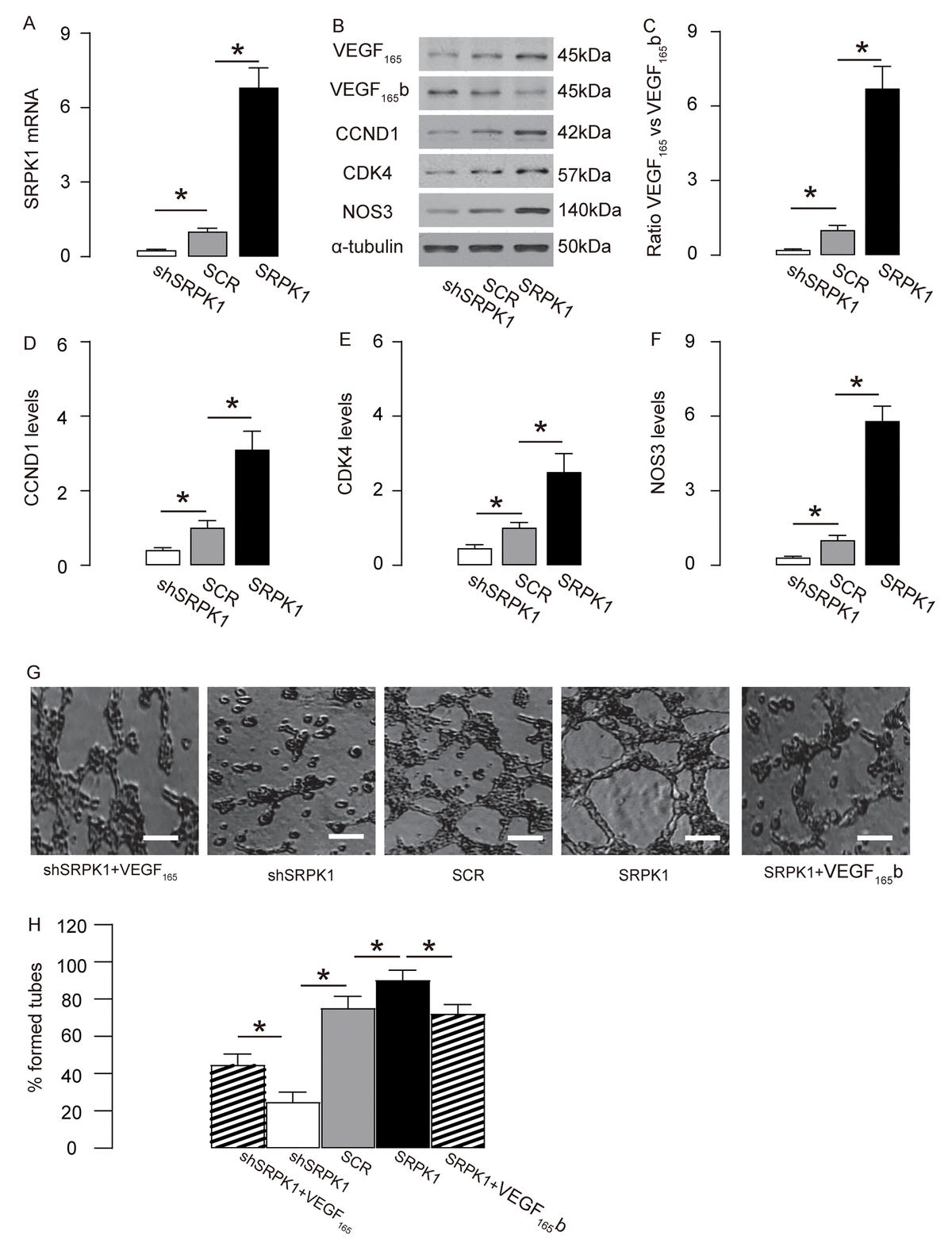 Figure 5. SRPK1 promotes AEC proliferation through increasing pro-angiogenic splicing of VEGF-A in vitro. (A) RT-qPCR for SRPK1 in shSRPK1, or SCR, or SRPK1- transfected MS1 cells. (B) Representative western blots of SRPK1-modified MS1 cells. (C-F) Quantification of ratio of VEGF165 versus VEGF165b (C), CCND1 (D), CDK4 (E) and NOS3 (F) protein levels in SRPK1-modified MS1 cells. (G-H) Tube formation assay using SRPK1/VEGF165/VEGF165b -modified MS1 cells, shown by representative images (G), and by quantification (H). *p<0.05. N=5. Scale bars are 50µm.