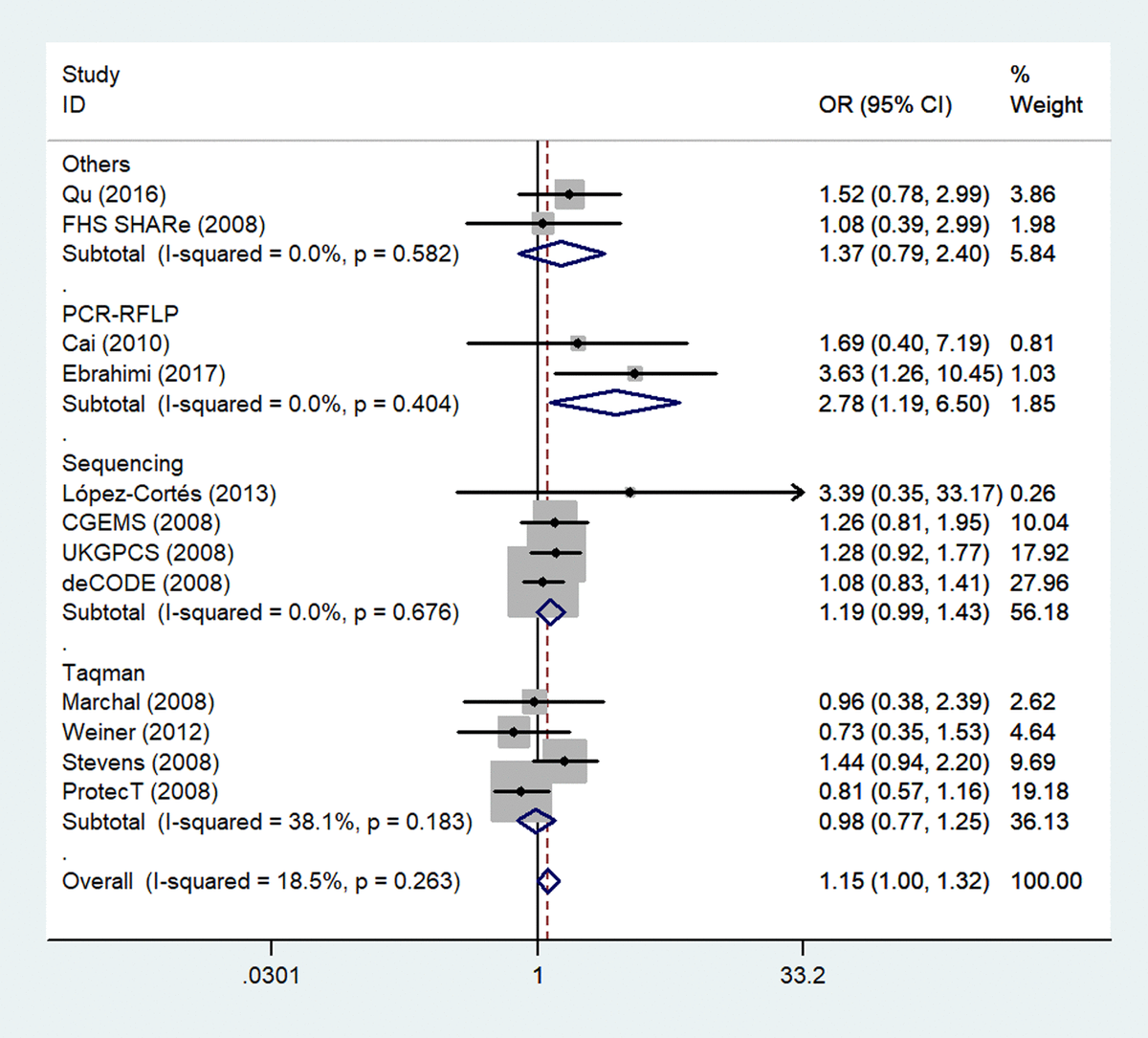 Figure 6. A forest plot of PCa risk associated with rs1805087 in terms of genotype methods (GG vs. AA). The squares and horizontal lines correspond to the study-specific OR and 95% CI. The area of the squares reflects the weight (inverse of variance). The diamond represents the summary OR and 95% CI.
