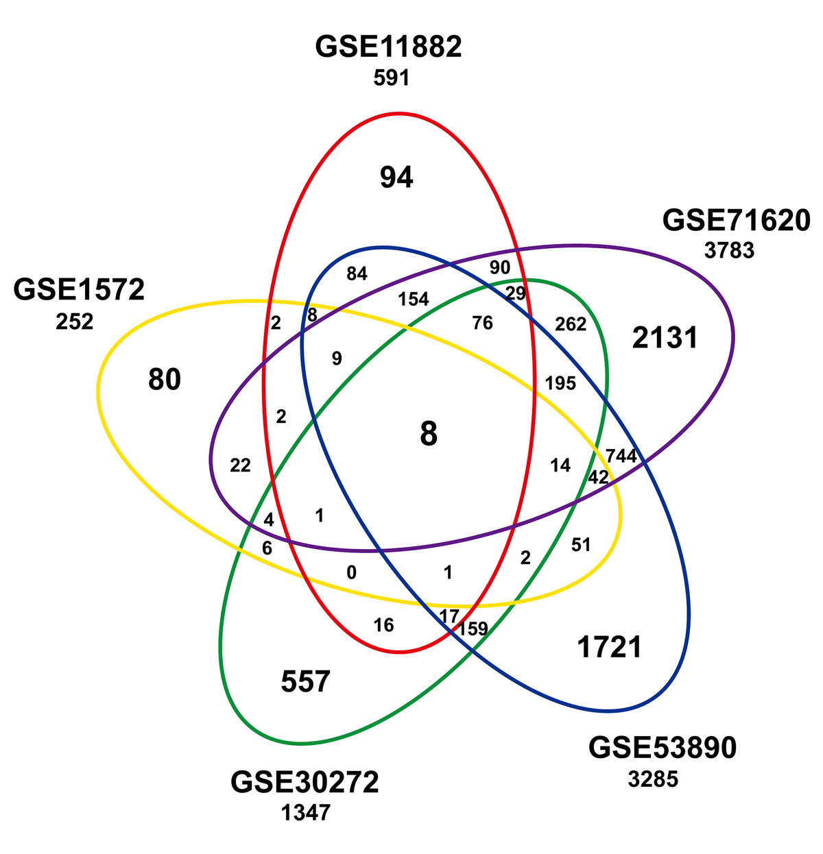 Figure 1.Significant age-associated genes in studies of the frontal cortex compendium. Shown is a Venn analysis performed to determine the overlap of significantly age-associated genes identified in five independent studies.