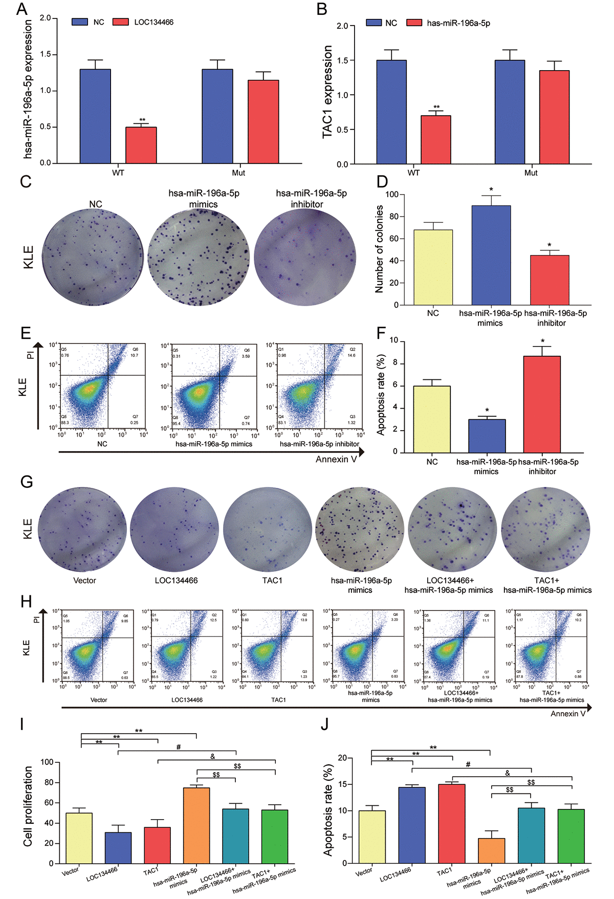 Figure 10. The relationship among LOC134466, hsa-miR-196a-5p and TAC1, and the effects of hsa-miR-196a-5p on cell proliferation and apoptosis. (A) The effect of LOC134466 on hsa-miR-196a-5p expression was determined by dual-luciferase reporter gene assay. (B) The effects of hsa-miR-196a-5p on TAC1 expression was determined by dual-luciferase reporter gene assay. (C-D) The effects of hsa-miR-196a-5p on cell proliferation were assessed by colony formation assay. (E-F) The effects of hsa-miR-196a-5p on cell apoptosis was assessed by Annexin V/PI double staining and apoptosis rates were calculated. (G) The effect of LOC134466/hsa-mir-196a-5p/TAC1 axis on EC was analyzed by plate clone formation assay. (H-J) The roles of LOC134466/hsa-miR-196a-5p/TAC1 axis on cell apoptosis and cell proliferation were determined by Annexin V/PI double staining and colony formation assay respectively. *P<0.05, **P<0.01, compared with vector group. #P<0.05, compared with LOC134466 group, &P<0.05 compared with TAC1 group, $$P<0.01 compared with hsa-miR-196a-5p group.