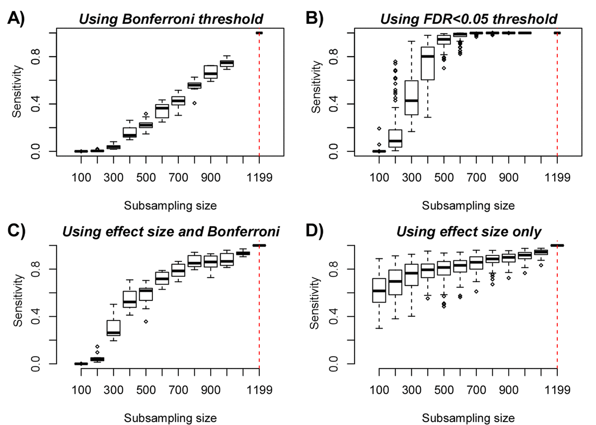 Figure 4. Empirical Power Analysis. (A) Boxplot of the sensitivity (y-axis) to detect gold-standard aDMPs, defined at the full purified monocyte sample size n=1199, at random subsampling sizes (x-axis), as indicated. Each boxplot displays the sensitivity over 10 separate runs, in each run aDMPs were defined at the Bonferroni 0.05 level. (B) As A), but now defining aDMPs in each run as those with an FDR<0.05. Because the FDR estimates are more unstable, we performed 100 runs at each subsampling size. (C) As A), but now defining the gold-standard set of aDMPs by imposing a threshold on the effect size (2% DNAm change over 10 years), in addition to a Bonferroni adjusted P-value < 0.05. At each subsampling run, aDMPs were also defined using the same criterion and 10 runs were performed at each subsampling size. (D) As A), but now only using the threshold on the effect size to define gold-standard aDMPs and to define aDMPs each subsampling size. A total of 100 runs at each subsampling size were performed.