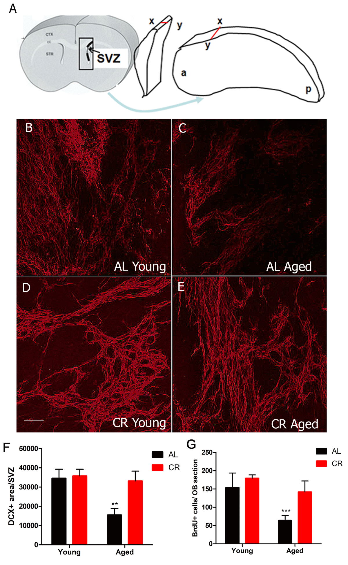 Figure 2. Calorie restriction protects against the loss of neurogenesis in the aged SVZ. (A) Cartoon showing the 3-dimensionally preserved SVZ wholemount. (B-E) Confocal projection images of immunohistochemistry for the neuroblast marker DCX performed on SVZ wholemounts in young and aged AL and CR mice. (F) Quantification of the amount of DCX immunostaining for the different groups. (G) Quantification of the number of BrdU+ cell in the olfactory bulb two weeks after BrdU injection. *** = p< 0.001, ** = p<0.01, two-way ANOVA, data are presented as mean ± SEM, n=5/group. Scale bar = 50 µm.
