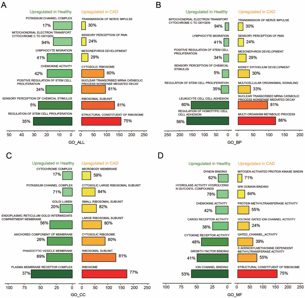 Figure 2.Seven most significantly enriched pathways up-regulated in healthy and CAD blood samples were presented. (A–D) Seven most distinctively activated GO_ALL, GO_BP, GO_CC, GO_MF pathways in healthy and CAD blood samples.