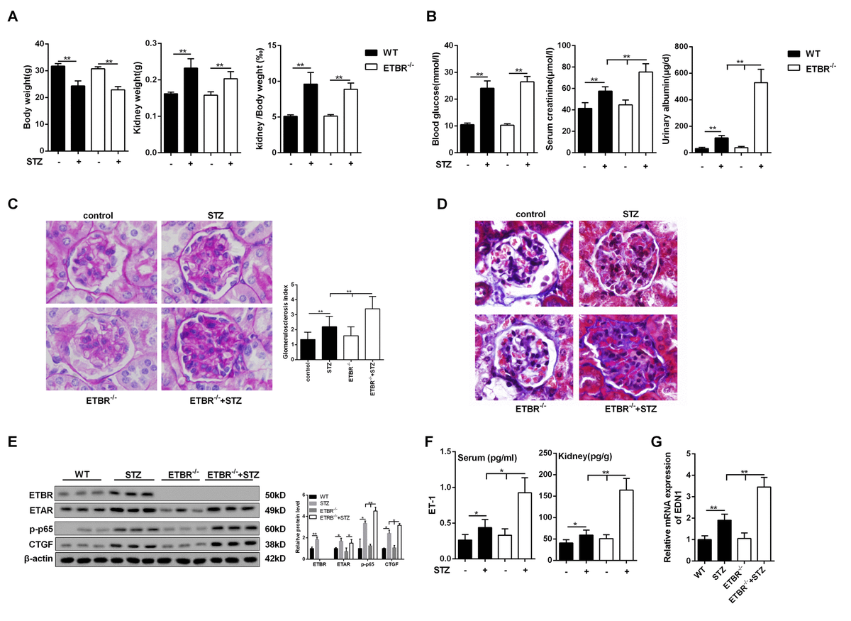 Figure 2. Severer diabetic nephropathy in ETBR-/- mice. (A) Body weight and kidney weight were detected in control mice (WT), STZ-diabetic mice, ETBR-/- mice and STZ-diabetic ETBR-/- mice. **p<0.01, compared with control. N=5. (B) Serum glucose level, serum creatinine level and urinary albumin level were measure in control mice (WT), STZ-diabetic mice, ETBR-/- mice and STZ-diabetic ETBR-/- mice. **p<0.01, compared with control or STZ-diabetic WT mice. (C) Periodic acid-Schiff (PAS) staining of kidney tissues from control mice, STZ-diabetic WT mice, ETBR-/- mice, and STZ-diabetic ETBR-/- mice. **p<0.01, compared with control, STZ-diabetic WT, or ETBR-/- mice. 1000×magnification. (D) MASSON staining of of kidney tissues from control mice, STZ-diabetic WT mice, ETBR-/- mice, and STZ-diabetic ETBR-/- mice. 1000×magnification. (E) Protein levels of ECM-related protein CTGF and p-p65 in control mice, STZ-diabetic WT mice, ETBR-/- mice, and STZ-diabetic ETBR-/- mice. *p<0.05, compared with WT, ETBR-/-, or STZ mice. **p<0.01, compared with WT, ETBR-/-, or STZ mice. N=3. (F-G) Serum ET-1/kidney ET-1 expressions and transcriptional level of EDN1 from kidney were detected in control mice, STZ-diabetic WT mice, ETBR-/- mice, and STZ-diabetic ETBR-/- mice. *p<0.05, **p<0.01, compared with WT, ETBR-/-, or STZ mice. Bars depict the mean ± SD. N=5.