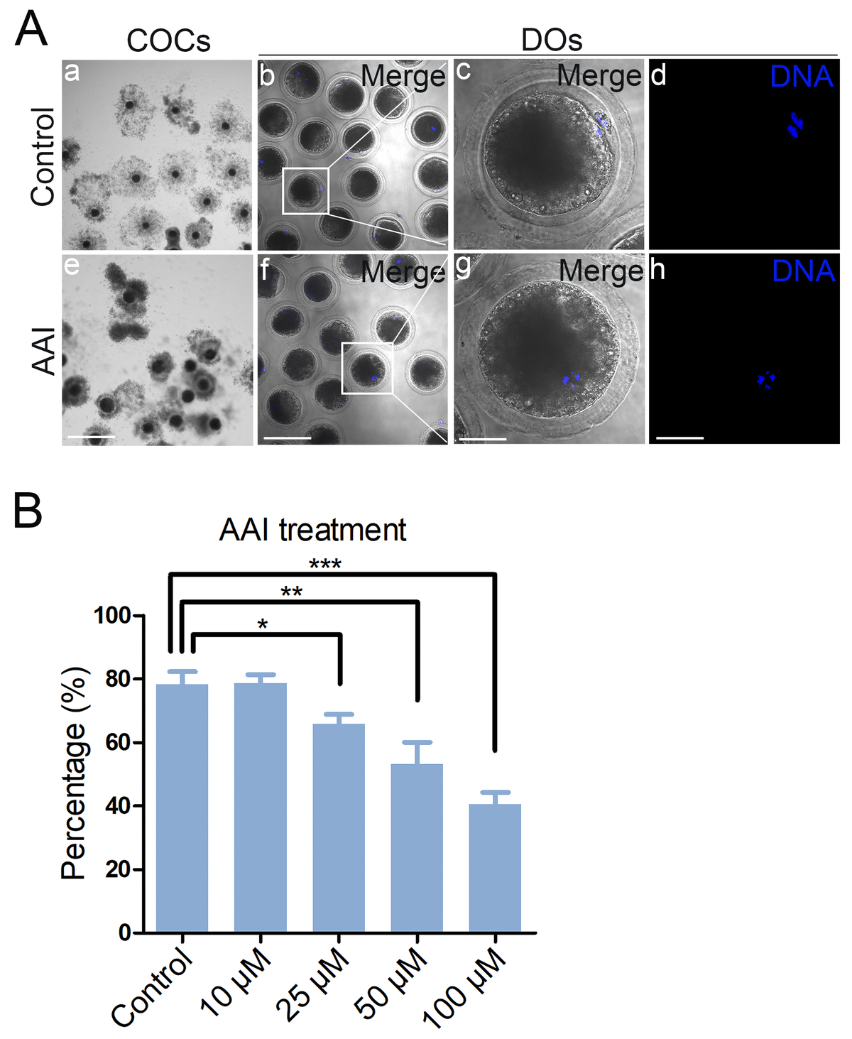 Figure 1. Effects of different doses of AAI on the porcine oocyte maturation. (A) Representative images of oocyte meiotic progression in control and AAI-exposed oocytes. Cumulus cell expansion of cumulus oocyte complexes (COCs) and polar body extrusion (PBE) of denuded oocytes (DOs) were imaged by the confocal microscope. Scale bar, 360 μm (a, e); 120 μm (b, f); 40 μm (c, g); 40 μm (d, h). (B) The rate of PBE was recorded in control and different concentrations of AAI-exposed groups (10 μM, 25 μM, 50 μM and 100 μM) after culture for 44 h in vitro. Data were presented as mean percentage (mean ± SEM) of at least three independent experiments. *P < 0.05, **P < 0.01, ***P < 0.001.