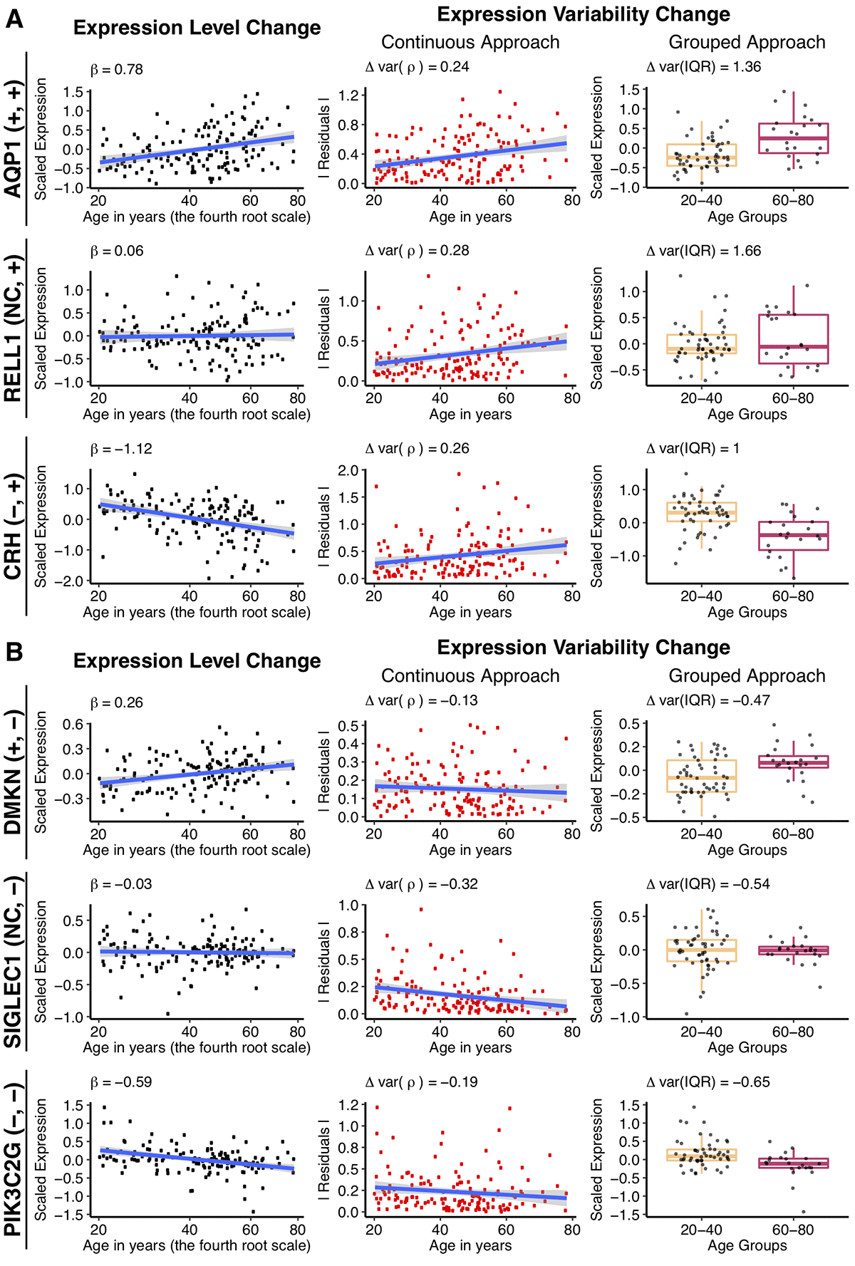 Figure 2. Changes in gene expression and its variability with age for some individual genes, using the different approaches. Example genes are chosen that increase (A), or decrease (B) expression variability with age, when the mean gene expression either increases, does not change or decreases. The types of change, for expression and variability respectively, is shown in the parenthesis following the gene name, for each row. Genes were selected to have the biggest absolute values of Δvar(ρ) and Δvar(IQR) as well as demonstrate significant increase, decrease or no change in the expression level with age. The first column to the left illustrates mean expression level (regression-corrected) plotted against individual’s age on the x0.25 – transformed scale. The regression line is colored in blue, with the β1 coefficient from the linear regression shown on the graph. The middle column illustrates the continuous approach to measure differential variability. Absolute values of the residuals (in red) from the regression line are plotted against age and the regression line between residuals and age (in blue) is drawn for illustrative purposes. The Spearman correlation estimates, Δvar(ρ) between the residuals and age are displayed on the graph and used in the subsequent analysis. The last column on the right illustrates the grouped approach to calculate differential variability. Gene expression levels (regression-corrected) of the individuals from the “young” (20 – 40 years old) and “old” (60 – 80 years old) groups are represented in the corresponding boxplots. A small random deviation (jitter) from the x-axis is applied for better visualization. Δvar(IQR), the fractional change in the variability in the “old” group, as compared to the “young”, is displayed on the graph.