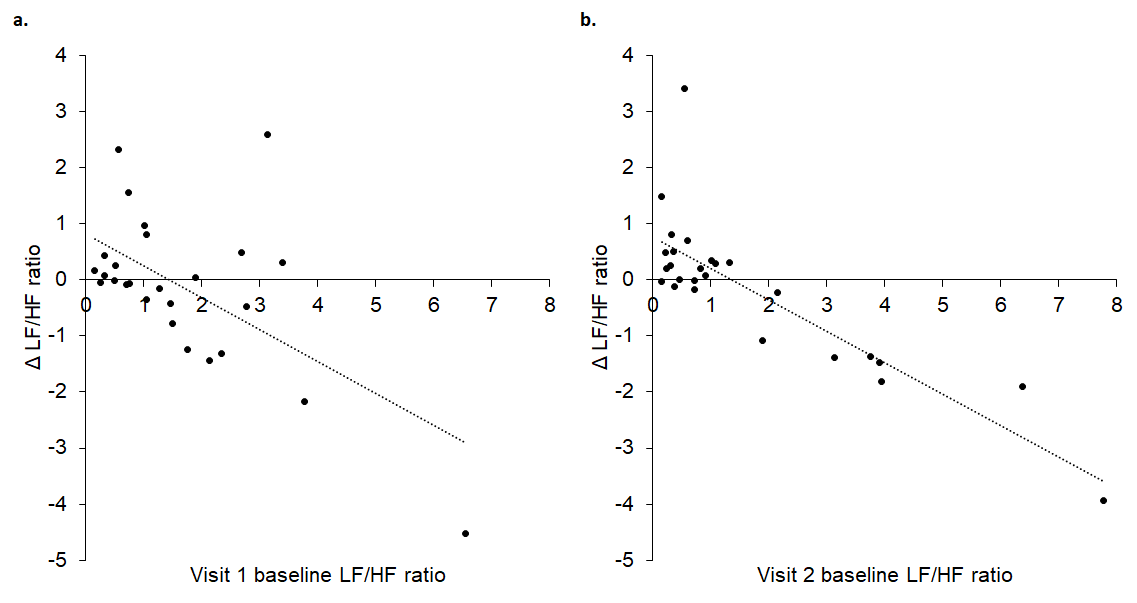Figure 5. Baseline LF/HF ratio in visits 1 (A) and 2 (B) significantly predicted change in LF/HF ratio between baseline and tVNS. Δ refers to the differences between baseline and tVNS.