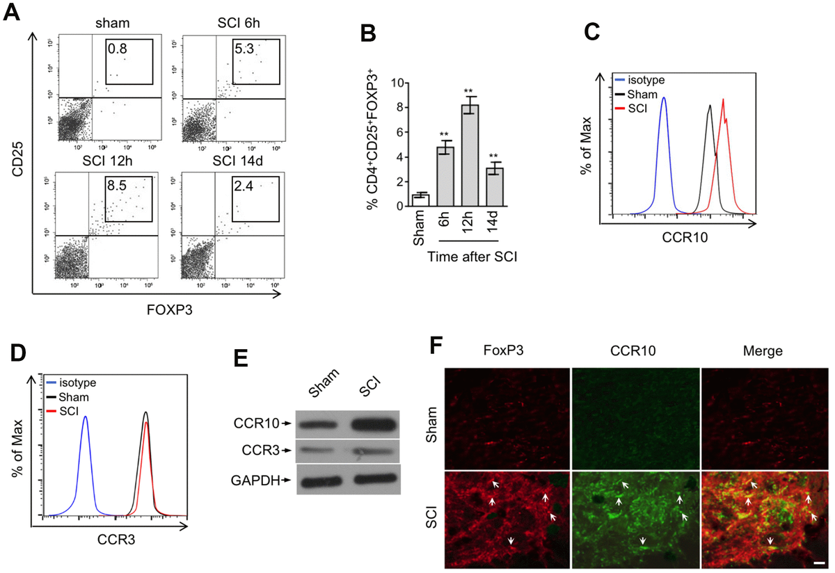 Figure 3. CCR10-expressing CD4+CD25+FOXP3+ Treg cells are enriched in the spinal cord after SCI. (A, B) Representative flow cytometry dot plots (A) and percentage (B) of CD4+CD25+FOXP3+ cells among the CD4+ T cells in the spinal cord after sham or SCI surgery. Cells were gated on 7-AAD negative population and the numbers inside plots refer to % Treg cells (n=5). (C, D) Representative histogram of CCR10 (C) and CCR3 (D) expression in CD4+CD25+FOXP3+ cells as gated in (A). (E) CD4+CD25+FOXP3+ cells in the spinal cord from sham and SCI mice were sorted out and analyzed by Western blotting to detect the expression of CCR10 and CCR3. GAPDH was used as a loading control. (F) Double immunostaining of FOXP3 (red) and CCR10 (green) in the spinal cord sections after sham or SCI surgery. The merged images are also shown. Arrows indicate cells with positive staining and colocalization. Scale bar, 100 μm. Data are mean ± SD. The statistical analysis was performed using Student’s t-test. **, P<0.01.