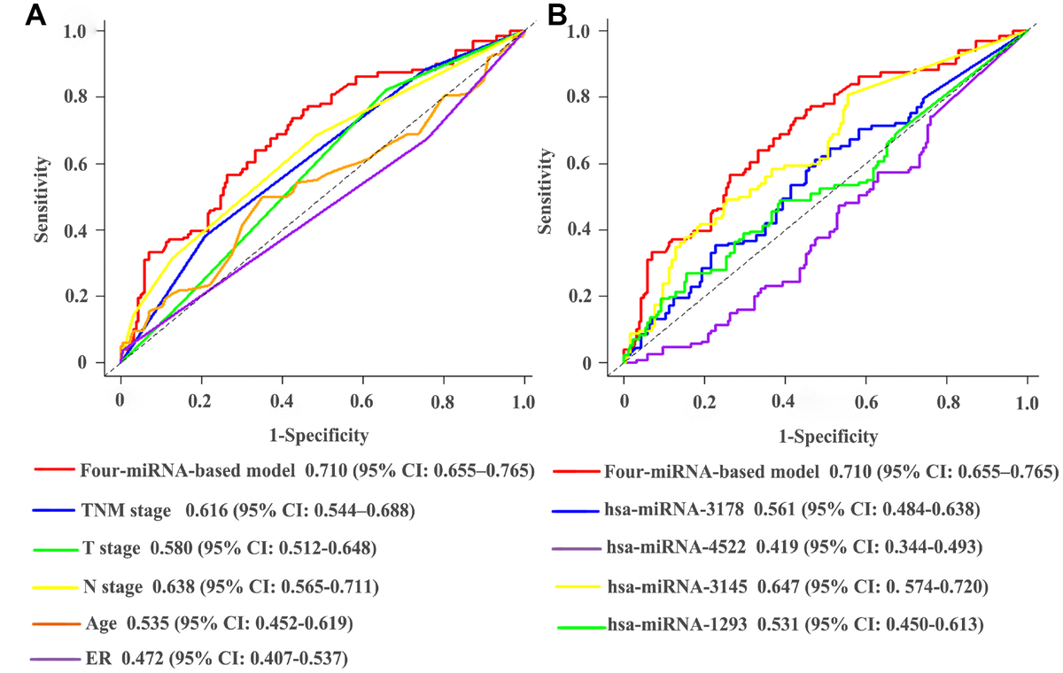 Figure 6. Comparisons of the predictive accuracy at 5-years DFS using time-dependent receiver operating characteristic curves in miRNA-based model with clinical risk factors (A), and miRNA-based model with single prognostic miRNA (B). DFS, disease-free survival.