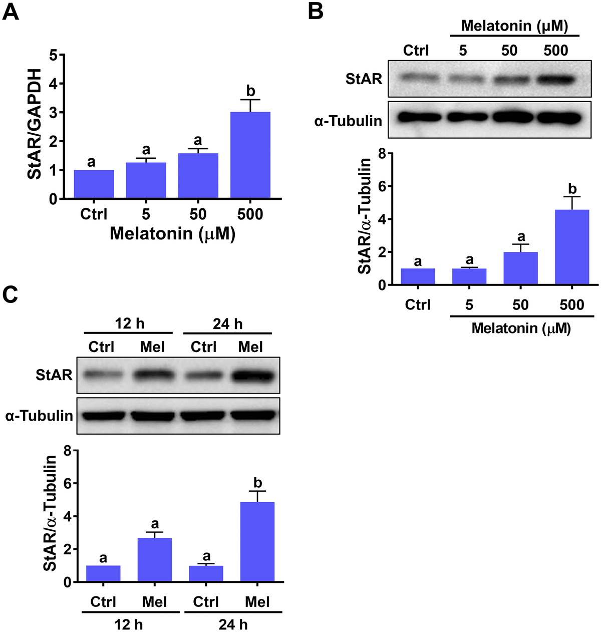 Figure 1. Melatonin stimulates StAR expression in primary human granulosa-lutein cells. Human granulosa-lutein (hGL) cells were treated with different concentrations of melatonin (Mel) for 24 h, and StAR mRNA (A) and protein (B) levels were examined by RT-qPCR and western blot, respectively. (C) Cells were treated with 500 μM melatonin for 12 and 24 h, and StAR protein levels were examined by western blot. Results are expressed as the mean ± SEM of 4 independent experiments. Values without a common letter are significantly different (p < 0.05).