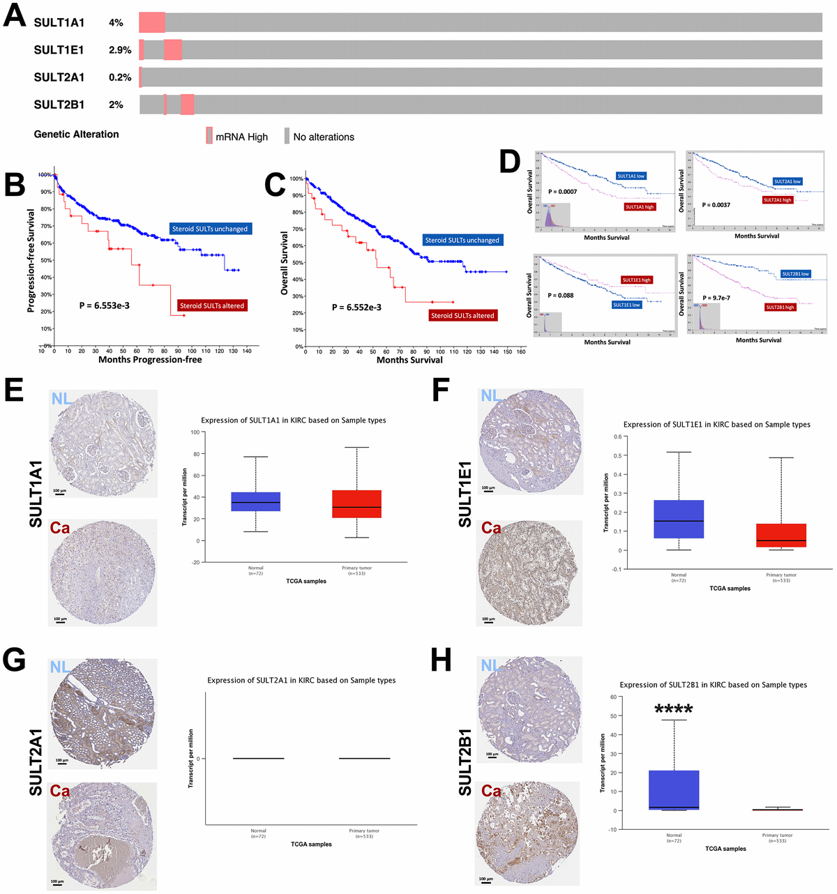Figure 1. Overexpression of steroid SULT genes is associated with worsened prognosis in ccRCC. Reproduced from the TCGA KIRC dataset with cBioPortal platform, shown are (A) Percentage of ccRCC case with overexpression of steroid sulfotransferase (SULT) genes amongst 534 cases; (B–C) Progression-free and overall survival (OS) between ccRCC patients with steroid SULT genes upregulated and unchanged. Reproduced from TCGA KIRC dataset with Human Protein Atlas platform, shown are (D) OS of ccRCC patients with high or low mRNA level of SULT1A1, SULT1E1, SULT2A2 and SULT2B1 at automatically defined cutoffs. Reproduced from TCGA KIRC dataset with GEPIA and UALCAN platform, shown are (E–H) Contrast in gene expressions of steroid SULT genes between normal and cancer tissue, respectively (****P < 0.0001).