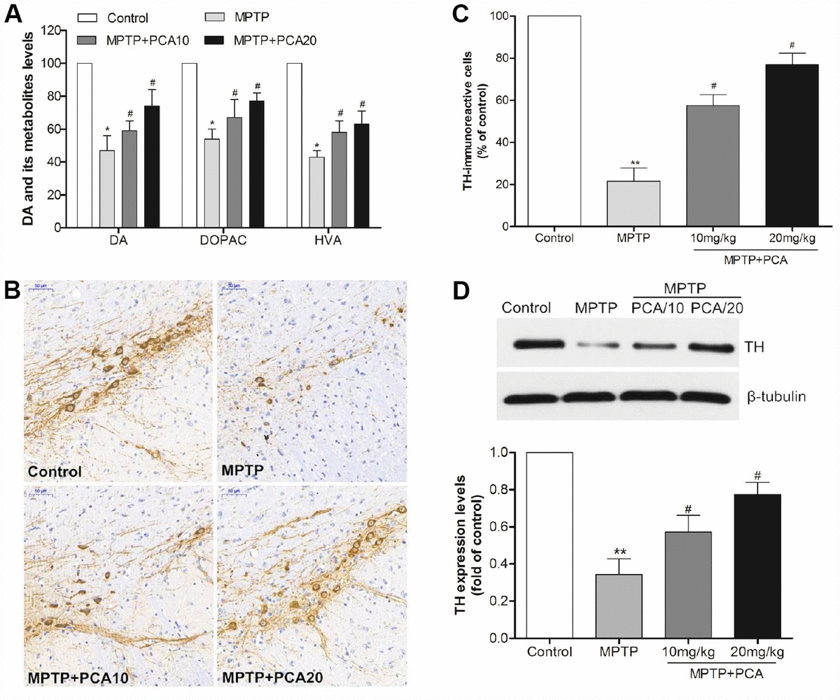 Figure 2. PCA alleviated dopaminergic neuronal loss in MPTP-intoxicated mice. (A) The levels of dopamine, DOPAC and HVA in the striatum were measured by HPLC. (B–C) Brain sections were immunostained for TH immunoreactivity in SN and TH positive cells were quantified. Scale bar, 50 μm. (D) Representative western blot bands and quantification of TH in each group. Data were expressed as mean ± S.D., n = 6; **P< 0.01,*P< 0.05 vs. control group; #P< 0.05 vs. MPTP group.