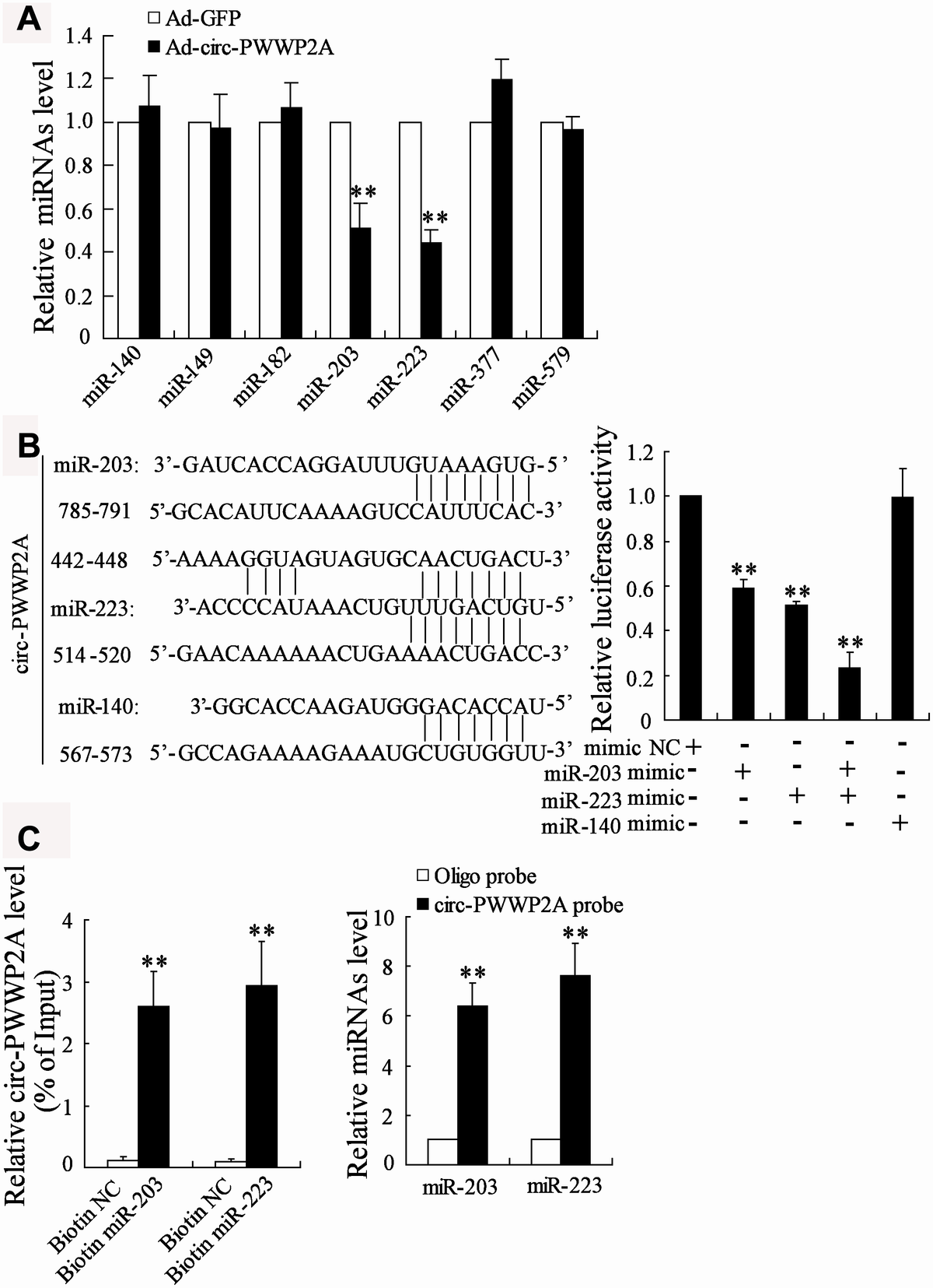 Figure 3. Interaction between circ-PWWP2A with miR-203 and miR-223. (A) The expression of several miRNAs which were predicted to bind with circ-PWWP2A by DIANA after overexpressing circ-PWWP2A in LX-2 cells. (B) After mutating the predicting sequences in circ-PWWP2A, the luciferase activity was detected using luciferase reporter assay. (C) The interaction between circ-PWWP2A with miR-203 and miR-223 was confirmed using agarose beads pull-down RNA-RNA interaction assay. **p<0.05 vs Ad-GFP. Ad-GFP, adenoviral vectors carrying green fluorescent protein genes that act as the control. NC, negative control.