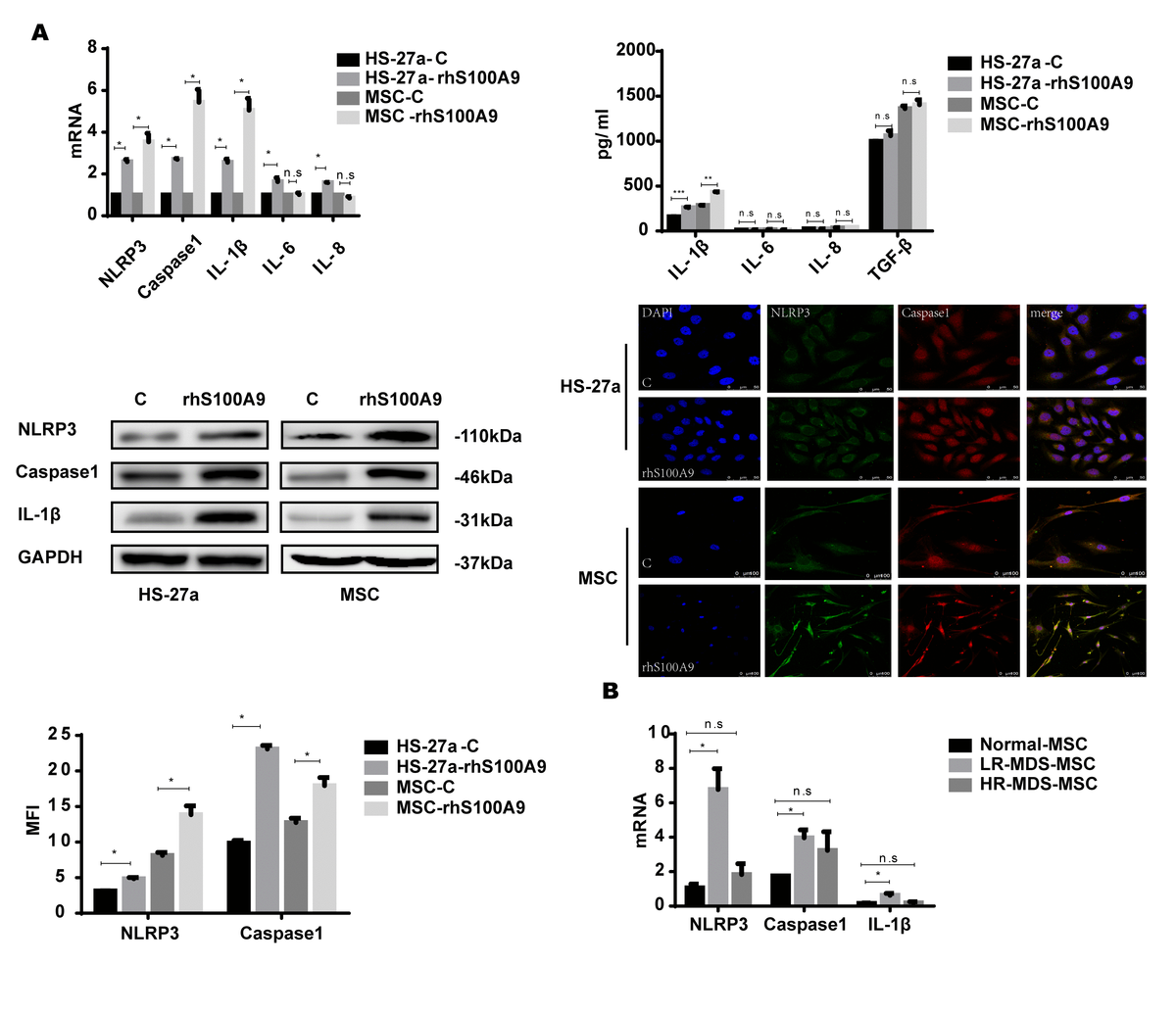 Figure 3. NLRP3 inflammasome and IL-1β secretion is involved in S100A9-induced cellular senescence. (A) Cells were treated with rhS100A9 for 72h. NLRP3, Caspase-1, IL-1β levels were measured using qPCR and western blot. IL-1β, IL-6, IL-8, and TGF-β expression and secretion was measured utilizing qPCR and ELISA. Representative confocal fluorescence micrograph of Caspase-1 and NLRP3 expression in cells treated with S100A9 (DAPI, blue; Caspase-1, red; and NLRP3, green; merged images show inflammasome formation; scale bars: HS-27a 50 μm and MSC 100 μm). (B) qPCR analyses of NLRP3, Caspase-1, and IL-1β expression in BM-MSCs isolated from MDS patient specimens (n = 18 LR-MDS, and n = 12 HR-MDS) compared with the levels in normal control BM-MNCs (n =18). Data are expressed as mean ± SD from three experiments. *P<0.05, **P<0.01, and ***P<0.001.