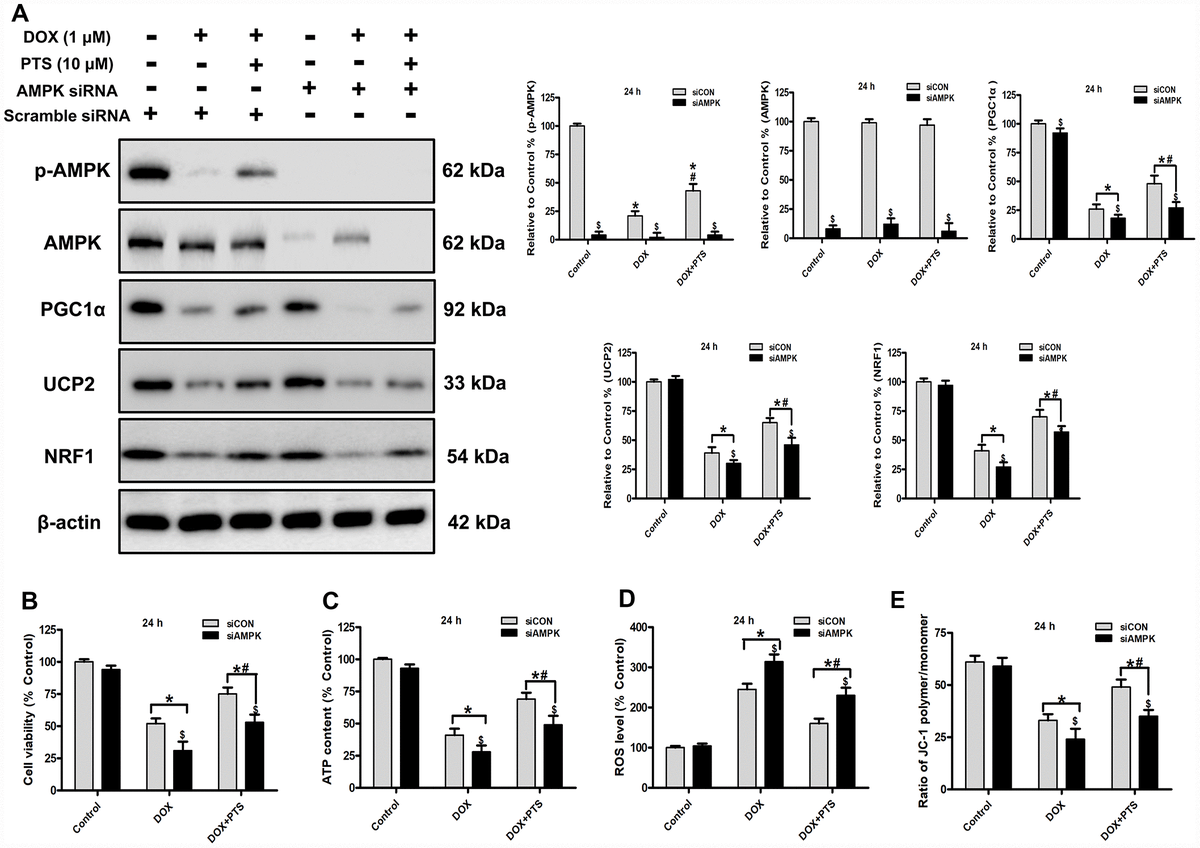 Figure 2. Effect of pterostilbene treatment combined with AMPK siRNA on cell viability, ATP content, ROS generation and ΔΨm, and AMPK and PGC1α signaling in DOX-treated H9c2 cells (24 h). (A) Representative western blot results of p-AMPK, AMPK, PGC1α, UCP2 and NRF1 are shown. Membranes were re-probed for β-actin expression to show that similar amounts of protein were loaded in each lane. (B) Cell viability, (C) cellular ATP content, (D) ROS level and (E) ΔΨm are shown, and (B–D) three indexes in the Control group of siCON are defined as 100%. The results are expressed as the mean ± SEM. *P < 0.05 vs. the Control group, #P < 0.05 vs. the 1 μM DOX-treated group, $P < 0.05 vs. the siCON group with the representative same drug treatments.